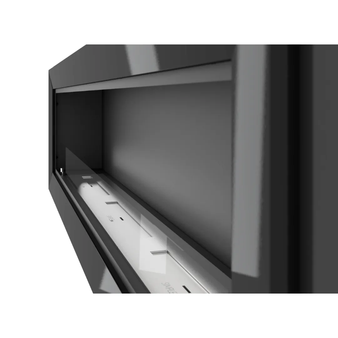 Kominek wyposażony jest w elegancką, przyciemnianą szybę ochronną, która zwiększa bezpieczeństwo użytkowania. Zabezpiecza płomień przed nagłymi podmuchami powietrza i ogranicza bezpośredni kontakt z ogniem. Jej przyciemnione wykończenie podkreśla nowoczesny design kominka, dodając mu głębi i wyrazistości. Dodatkowo wpływa na wizualny komfort, delikatnie tonując blask płomieni.