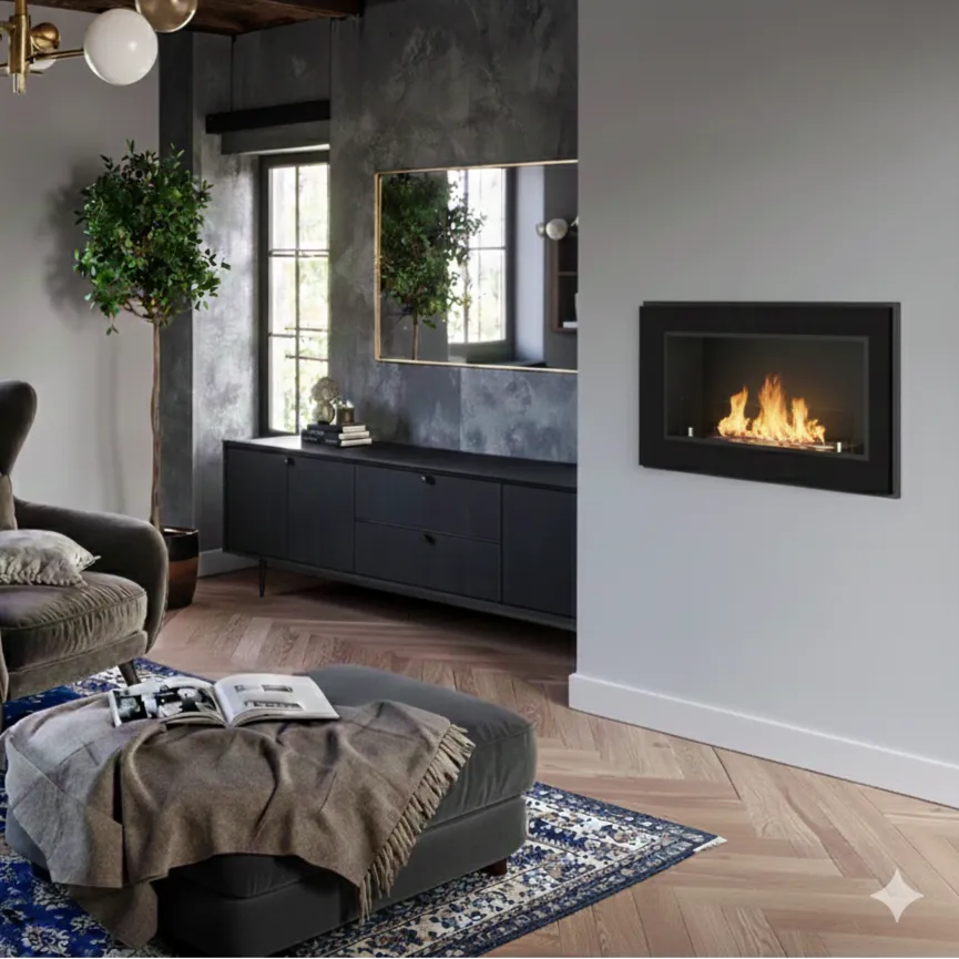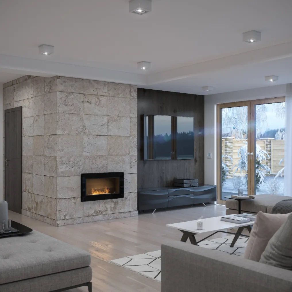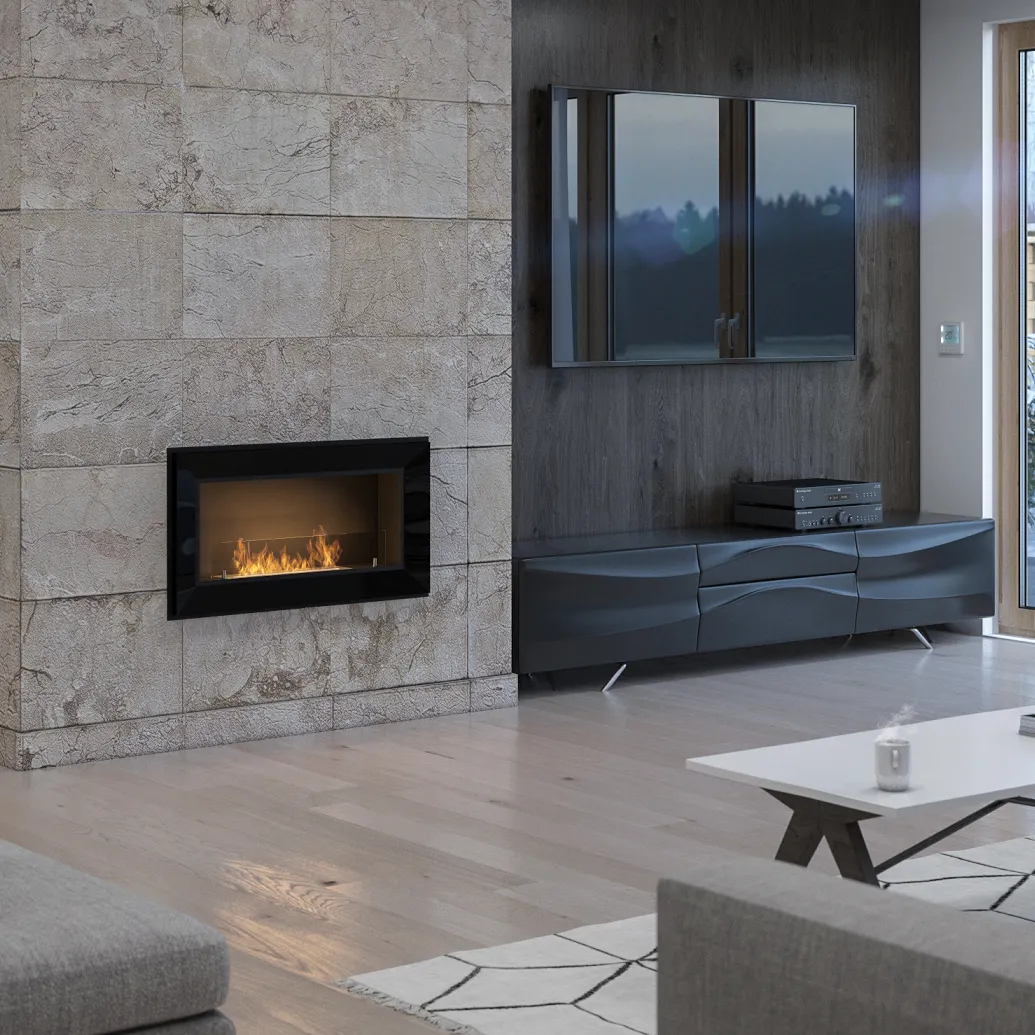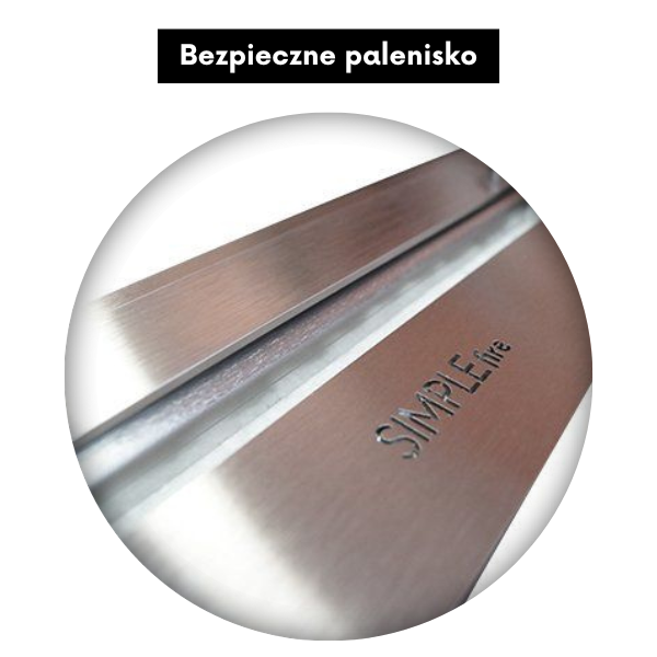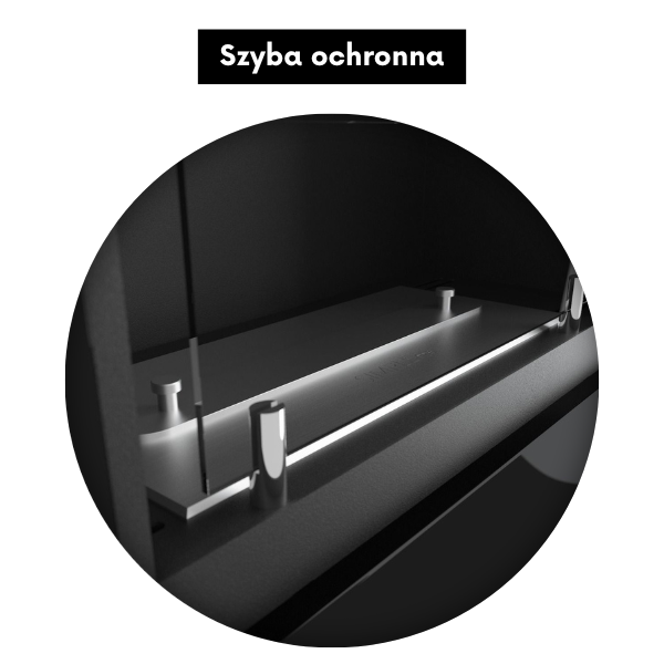 Kominek wyposażony jest w elegancką, przyciemnianą szybę ochronną, która zwiększa bezpieczeństwo użytkowania. Zabezpiecza płomień przed nagłymi podmuchami powietrza i ogranicza bezpośredni kontakt z ogniem. Jej przyciemnione wykończenie podkreśla nowoczesny design kominka, dodając mu głębi i wyrazistości. Dodatkowo wpływa na wizualny komfort, delikatnie tonując blask płomieni.