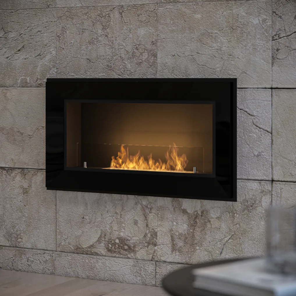 Model Frame 900 to uniwersalny biokominek, który można zawiesić bezpośrednio na ścianie lub wstawić w przygotowaną wnękę tak, aby rama zlicowała się ze ścianą. Dzięki wysuniętym poza korpus brzegom ramy nie trzeba się martwić o perfekcyjne wykończenie otworu pod urządzenie. Frame 900 Czarny z szybą wyposażony jest we własny system odpowietrzający, który chroni przed powstaniem ciśnienia pod paleniskiem w przypadku przelania urządzenia. Dodatkową ochronę stanowi również drugi zbiornik pod paleniskiem, który nie pozwoli wylanemu biopaliwu wydostać się poza obrys urządzenia. Biokominek doposażony jest w szybę ochronną, która podnosi bezpieczeństwo użytkowania oraz stabilizuje palenie się ognia. Wyjątkowa, uniwersalna forma oraz pięknie wykończona w połysku, fazowana czarna rama odnajdą się idealnie w każdej przestrzeni.