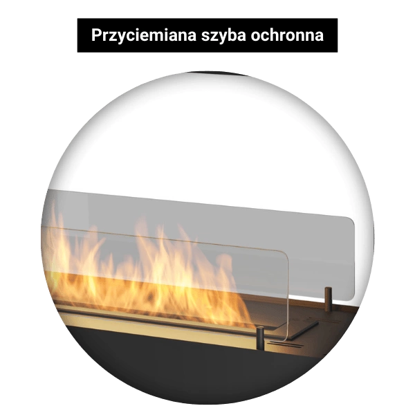 Kominek wyposażony jest w elegancką, przyciemnianą szybę ochronną, która zwiększa bezpieczeństwo użytkowania. Zabezpiecza płomień przed nagłymi podmuchami powietrza i ogranicza bezpośredni kontakt z ogniem. Jej przyciemnione wykończenie podkreśla nowoczesny design kominka, dodając mu głębi i wyrazistości. Dodatkowo wpływa na wizualny komfort, delikatnie tonując blask płomieni.