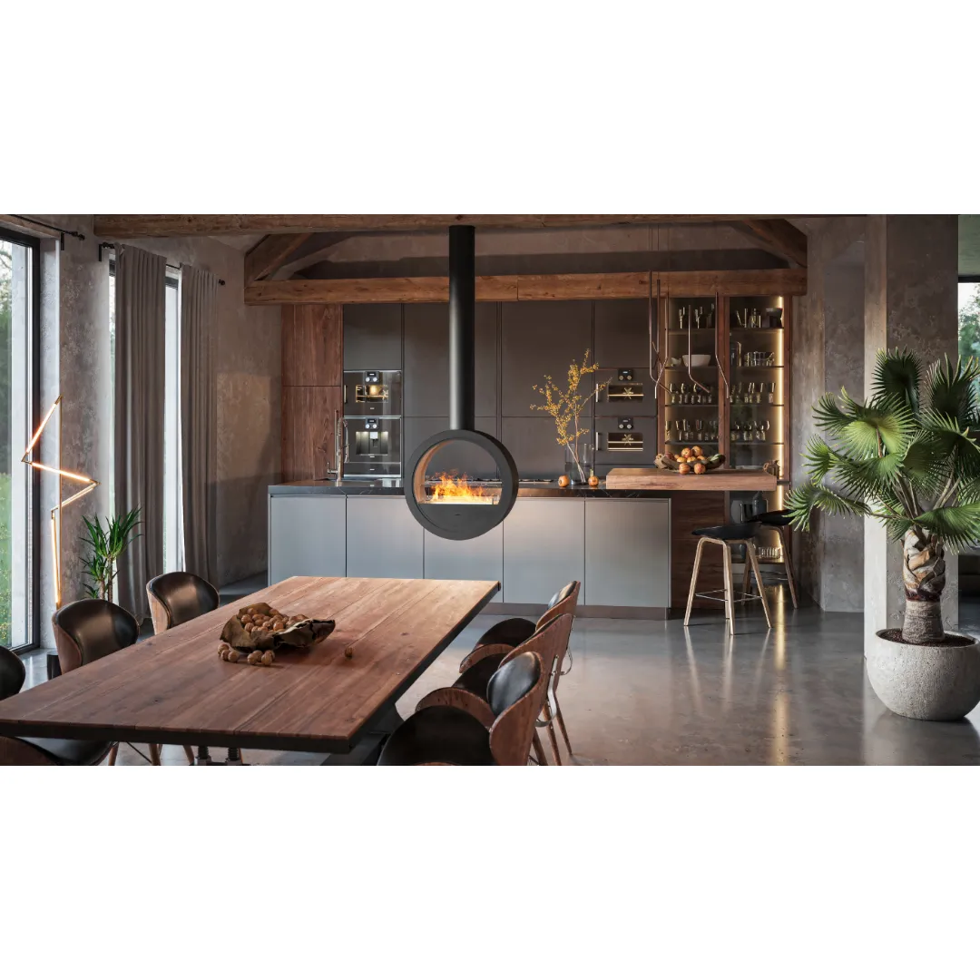 Model Incyrcle 2 side Czarny idealnie wpisuje się w kanony współczesnego wzornictwa. Zaokrąglone linie oraz wyjątkowy, sufitowy sposób montażu tworzą niepowtarzalną formę, która doskonale odnajdzie się w nowoczesnych aranżacjach. Kominek może stać się nie tylko centralnym punktem przestrzeni prywatnych, ale również doskonałym elementem dekoracyjnym restauracji, recepcji czy spa.