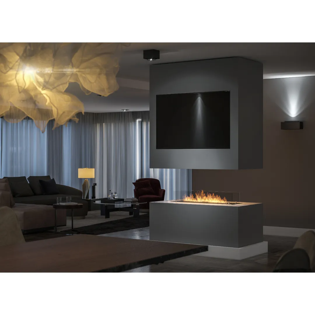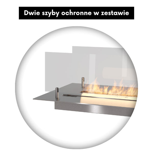 Kominek wyposażony jest w elegancką, przyciemnianą szybę ochronną, która zwiększa bezpieczeństwo użytkowania. Zabezpiecza płomień przed nagłymi podmuchami powietrza i ogranicza bezpośredni kontakt z ogniem. Jej przyciemnione wykończenie podkreśla nowoczesny design kominka, dodając mu głębi i wyrazistości. Dodatkowo wpływa na wizualny komfort, delikatnie tonując blask płomieni.
