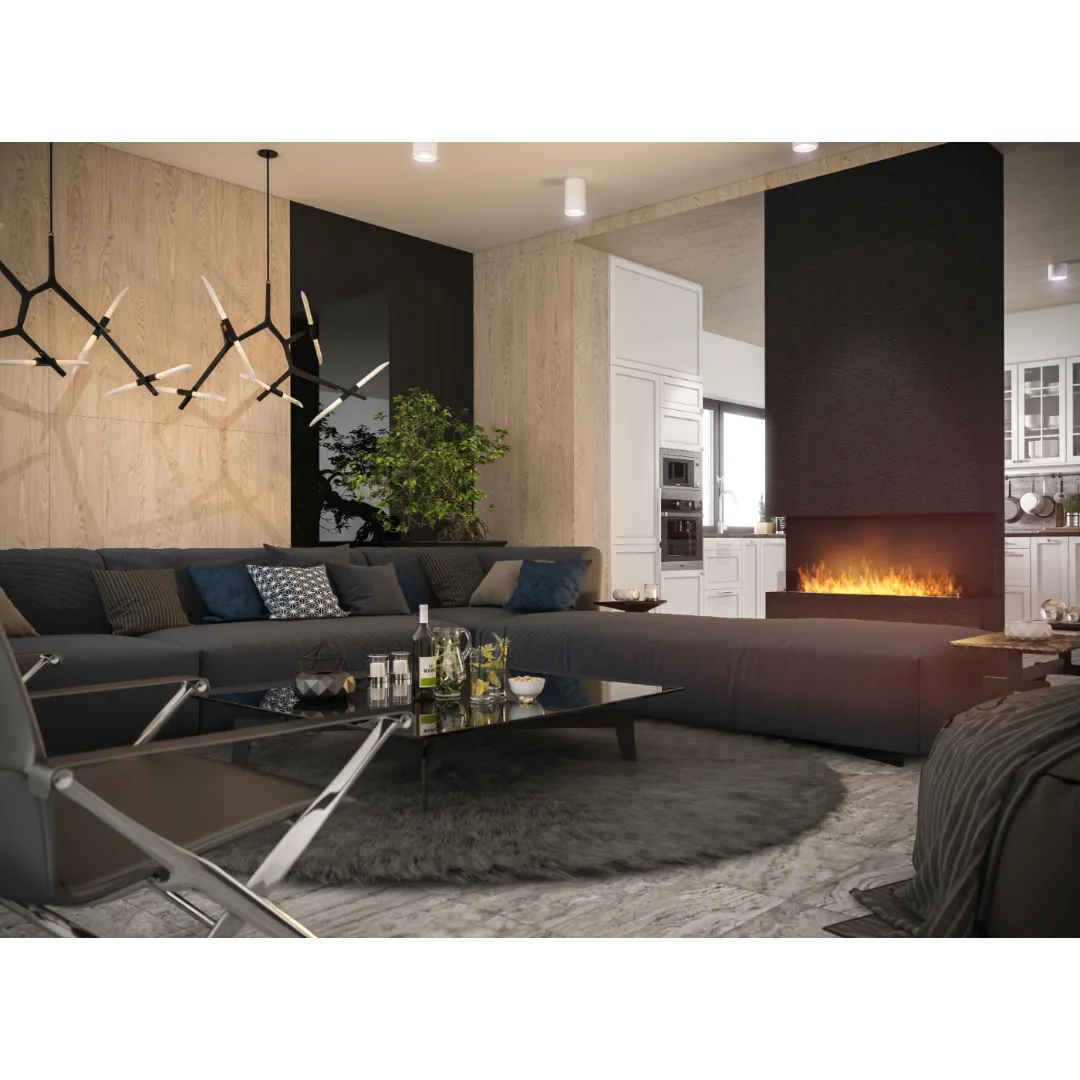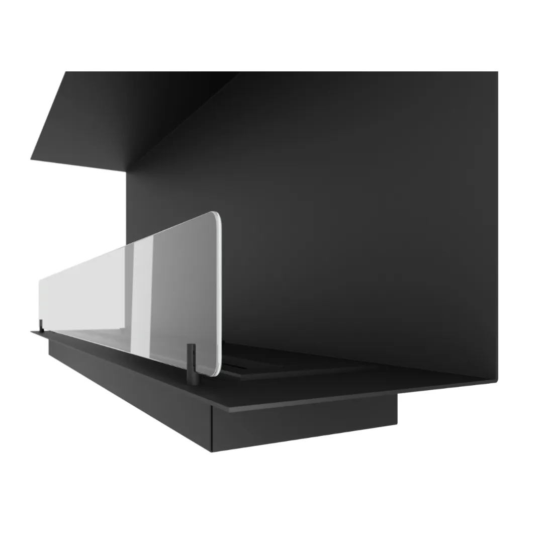 Kominek wyposażony jest w elegancką, przyciemnianą szybę ochronną, która zwiększa bezpieczeństwo użytkowania. Zabezpiecza płomień przed nagłymi podmuchami powietrza i ogranicza bezpośredni kontakt z ogniem. Jej przyciemnione wykończenie podkreśla nowoczesny design kominka, dodając mu głębi i wyrazistości. Dodatkowo wpływa na wizualny komfort, delikatnie tonując blask płomieni.