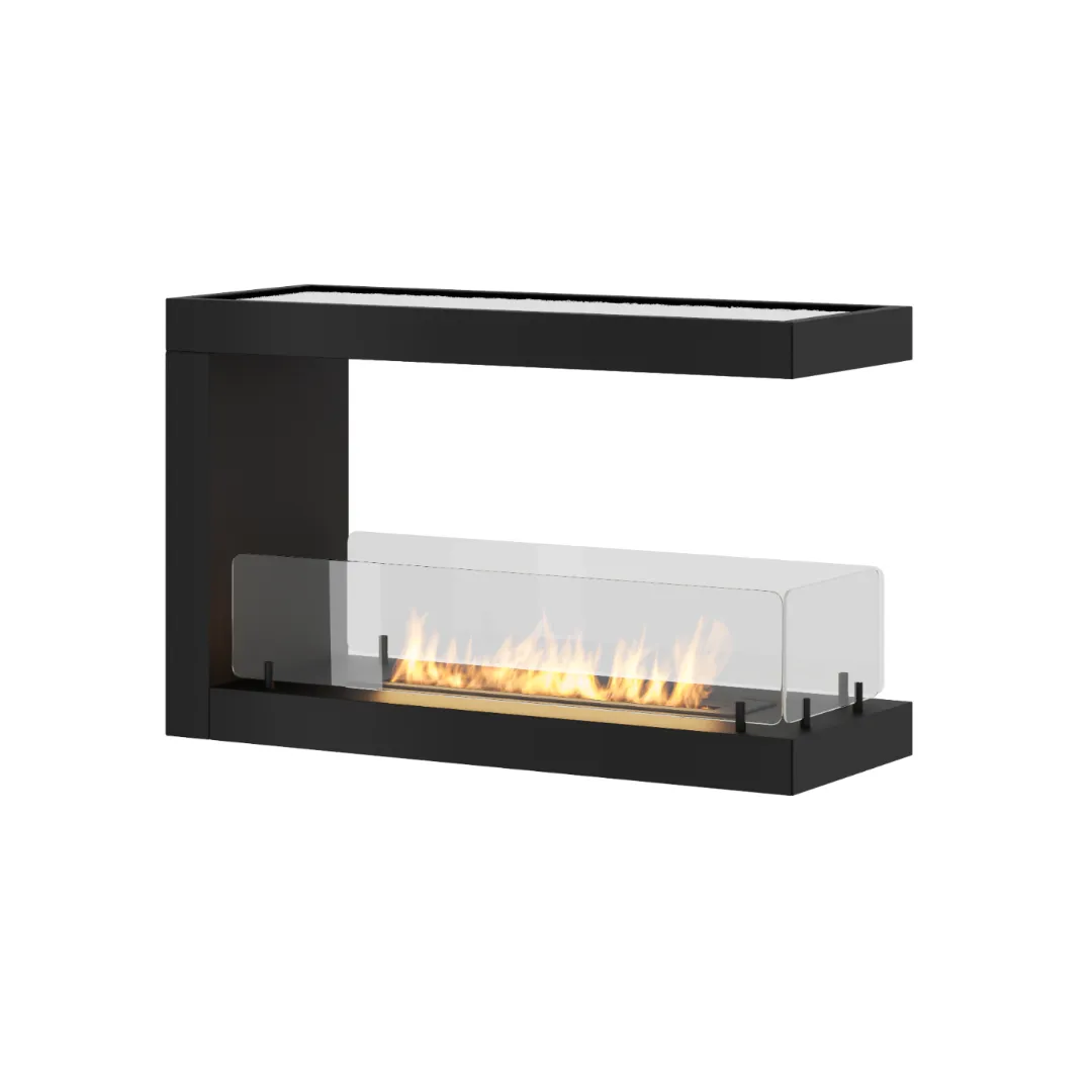 Kominek wyposażony jest w elegancką, przyciemnianą szybę ochronną, która zwiększa bezpieczeństwo użytkowania. Zabezpiecza płomień przed nagłymi podmuchami powietrza i ogranicza bezpośredni kontakt z ogniem. Jej przyciemnione wykończenie podkreśla nowoczesny design kominka, dodając mu głębi i wyrazistości. Dodatkowo wpływa na wizualny komfort, delikatnie tonując blask płomieni.