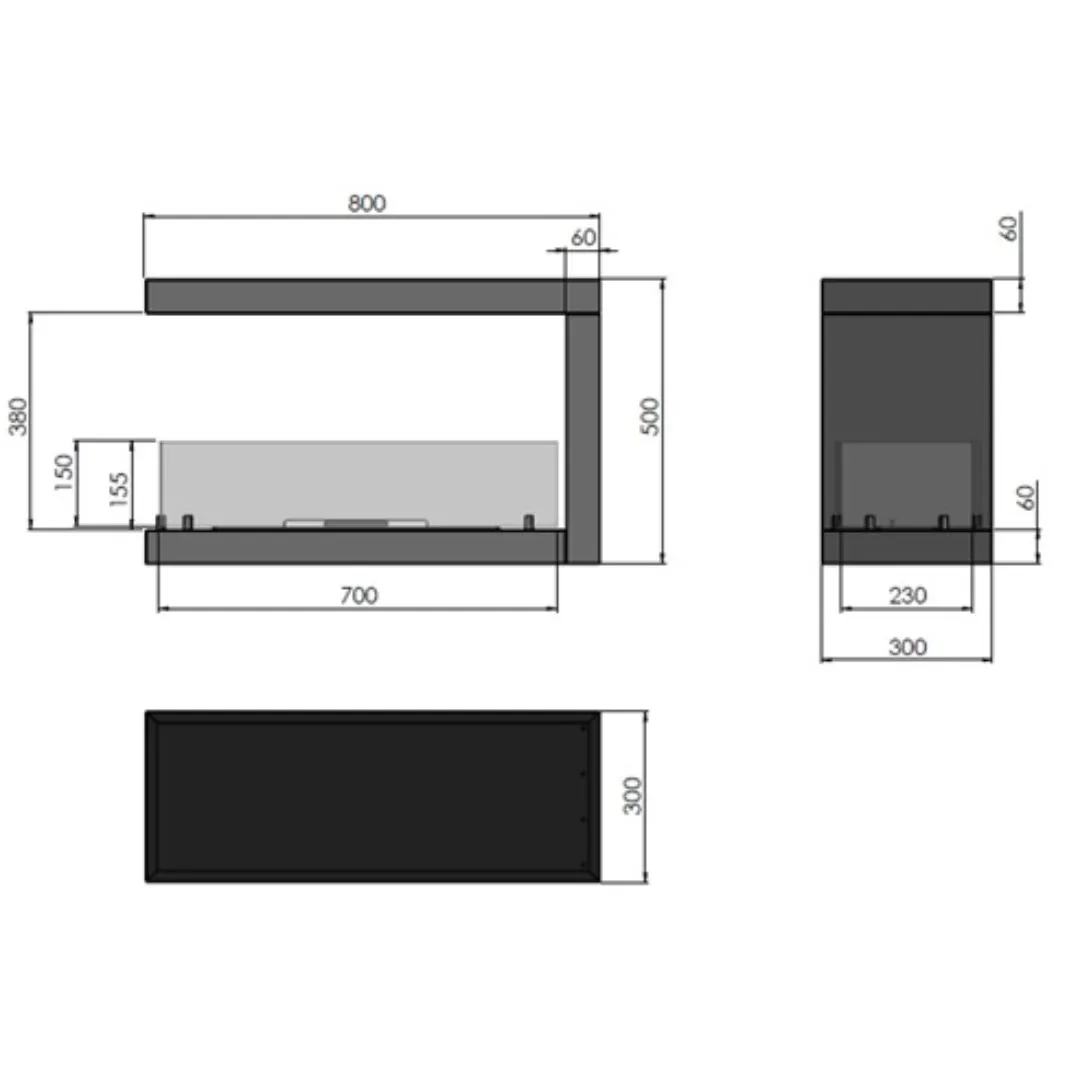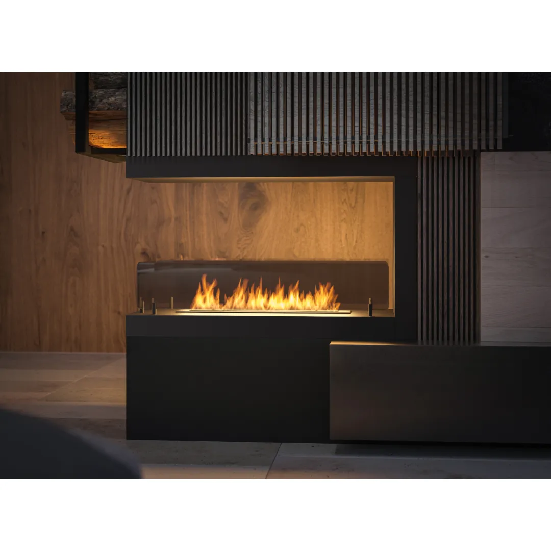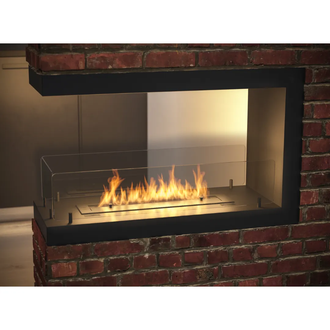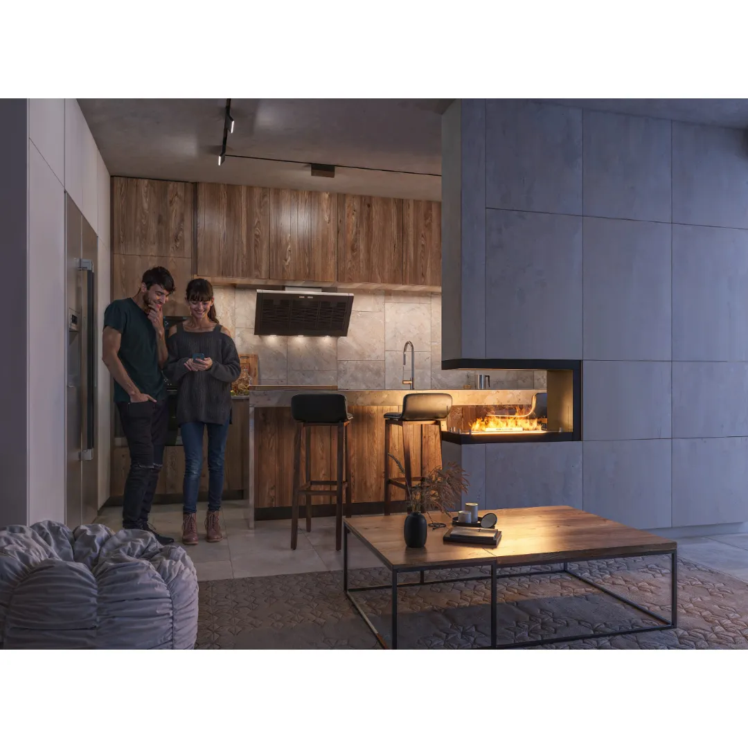 Inside U800 to trójstronna, wyjątkowo dopracowana forma dedykowana do montażu w ścianie działowej. Zabudowane ściany boczne sprawiają, że kominek prezentuje się doskonale z każdej perspektywy stanowiąc przyciągający wzrok, centralny punkt każdej zabudowy. Model wyposażony jest we własny system odpowietrzający, który chroni przed powstaniem ciśnienia pod paleniskiem w przypadku przelania urządzenia. Dodatkową ochronę stanowi również drugi zbiornik pod paleniskiem, który nie pozwoli wylanemu biopaliwu wydostać się poza obrys kominka. Standardowo wkład wyposażony jest również w trzy szyby ochronne, które podnoszą bezpieczeństwo użytkowania oraz stabilizują palenie się ognia. Biokominek posiada również wbudowaną izolację. Prosta, uniwersalna forma oraz pięknie wykończona czarna rama odnajdą się idealnie w każdej przestrzeni.
