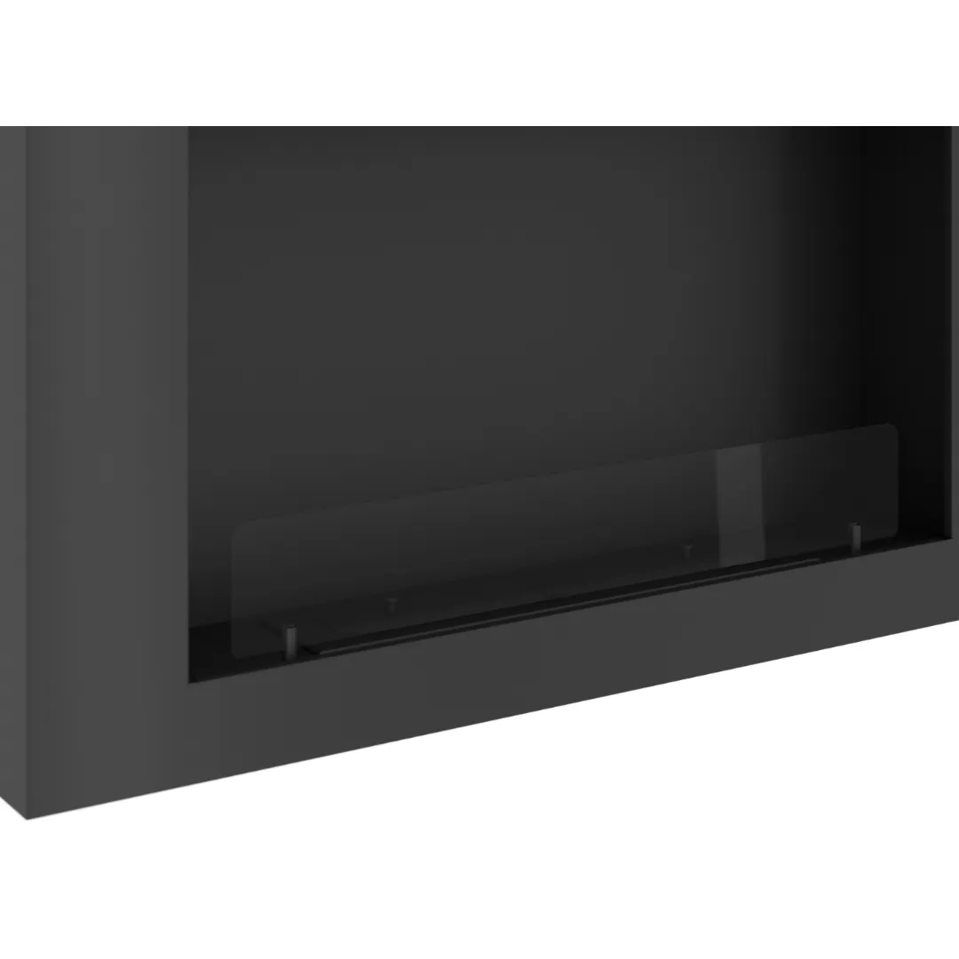 Kominek wyposażony jest w elegancką, przyciemnianą szybę ochronną, która zwiększa bezpieczeństwo użytkowania. Zabezpiecza płomień przed nagłymi podmuchami powietrza i ogranicza bezpośredni kontakt z ogniem. Jej przyciemnione wykończenie podkreśla nowoczesny design kominka, dodając mu głębi i wyrazistości. Dodatkowo wpływa na wizualny komfort, delikatnie tonując blask płomieni.