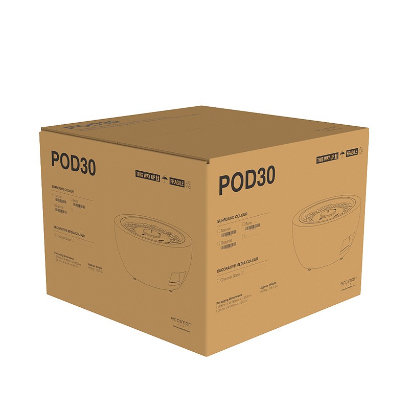 Pod 30 BK Natural to połączenie najwyższej jakości materiałów w naturalnych odcieniach z industrialną formą. Obudowa urządzenia wykonana jest z kompozytu betonowego Fluid™ Concrete. Materiał ten charakteryzuje się wysoką odpornością na działania atmosferyczne i uszkodzenia mechaniczne. Palenisko kominka, wykonane z najwyższej jakości stali nierdzewnej (gatunek 304), a wykończone czarną powłoką ceramiczną (górna powierzchnia), wypełnione jest wysoce absorbującymi włóknami ceramicznymi, które sprawiają, że żaden wstrząs, ani przewrócenie produktu nie spowoduje rozlania się paliwa. Biokominek można użytkować zarówno wewnątrz pomieszczeń, jak i w warunkach zewnętrznych.