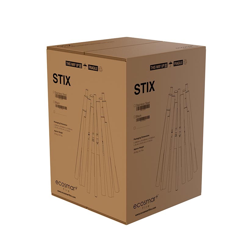 Stix Black BK to połączenie najwyższej jakości materiałów z industrialną formą. Zaprojektowany przez uznanego, barcelońskiego projektanta Hiroshi Tsunoda stanowi geometryczne połączenie wykonanych ze stali nierdzewnej, a pokrytych czarną farbą proszkową, rur o różnej długości. Stix to wyjątkowa rzeźba, nowoczesna interpretacja tradycyjnego ogniska oraz zwycięzca wielu prestiżowych konkursów, w tym Good Design Award 2011, Australian International Design Awards, DesignEx Best New Product 2011 oraz USA’s 2011 IIDA/HD Award for Excellence. Palenisko kominka, wykonane z najwyższej jakości stali nierdzewnej (gatunek 304), a wykończone czarną powłoką ceramiczną (górna powierzchnia), wypełnione jest wysoce absorbującymi włóknami ceramicznymi, które sprawiają, że żaden wstrząs, ani przewrócenie produktu nie spowoduje rozlania się paliwa. Biokominek można użytkować zarówno wewnątrz pomieszczeń, jak i w warunkach zewnętrznych.