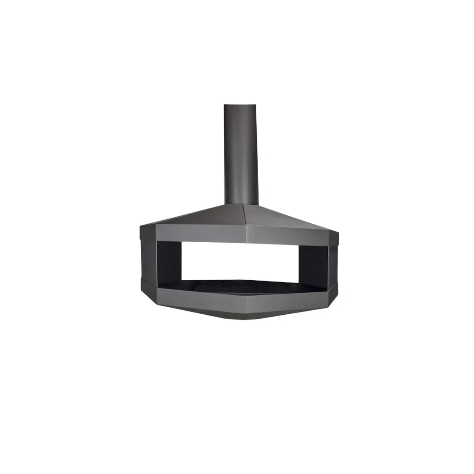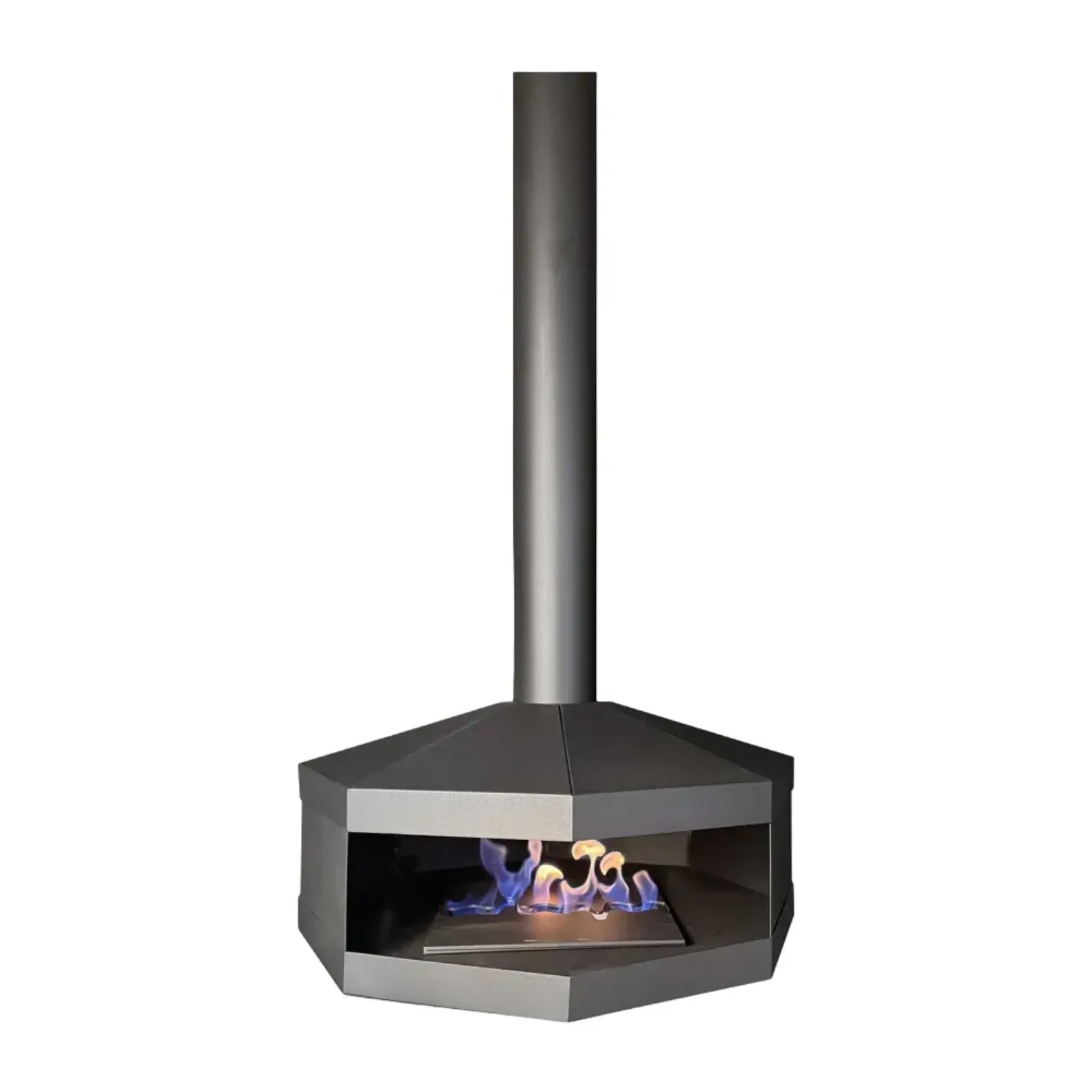 Obudowa biokominka wykonana jest z wysokogatunkowej stali o grubości 1,5 mm, malowanej proszkowo farbą termoodporną w kolorze czarnego półmatu, co zapewnia trwałość, odporność na uszkodzenia i efektowne wykończenie. Konstrukcja ma charakterystyczny, ośmiokątny kształt, może być otwarta jednostronnie lub dwustronnie, co pozwala podziwiać płomień z różnych perspektyw. Dzięki zastosowanym materiałom i formie biokominek prezentuje się niezwykle nowocześnie, a w większych przestrzeniach tworzy wyrazistą, niebanalną aranżację.