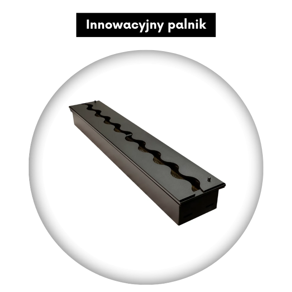 Biokominek wyposażony jest w nowoczesny palnik, który tworzy wyjątkową, falującą linię ognia, nadając wnętrzu niepowtarzalny klimat i głębię. Dzięki wycięciu w kształcie fali płomień nie jest jednolity, lecz nabiera dynamiki i przestrzenności, stając się wyjątkowym elementem dekoracyjnym nowoczesnych przestrzeni.