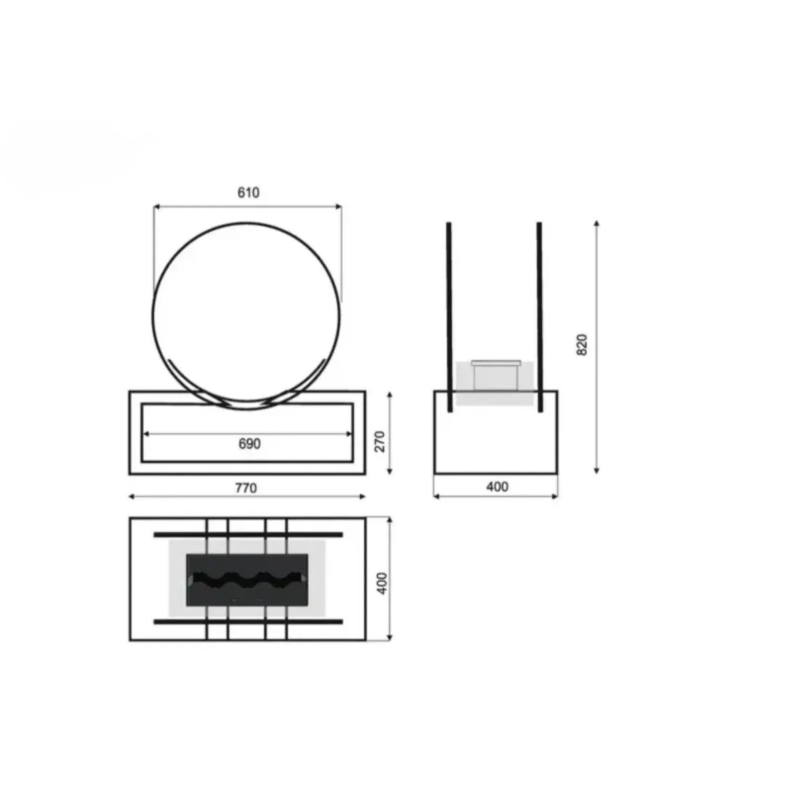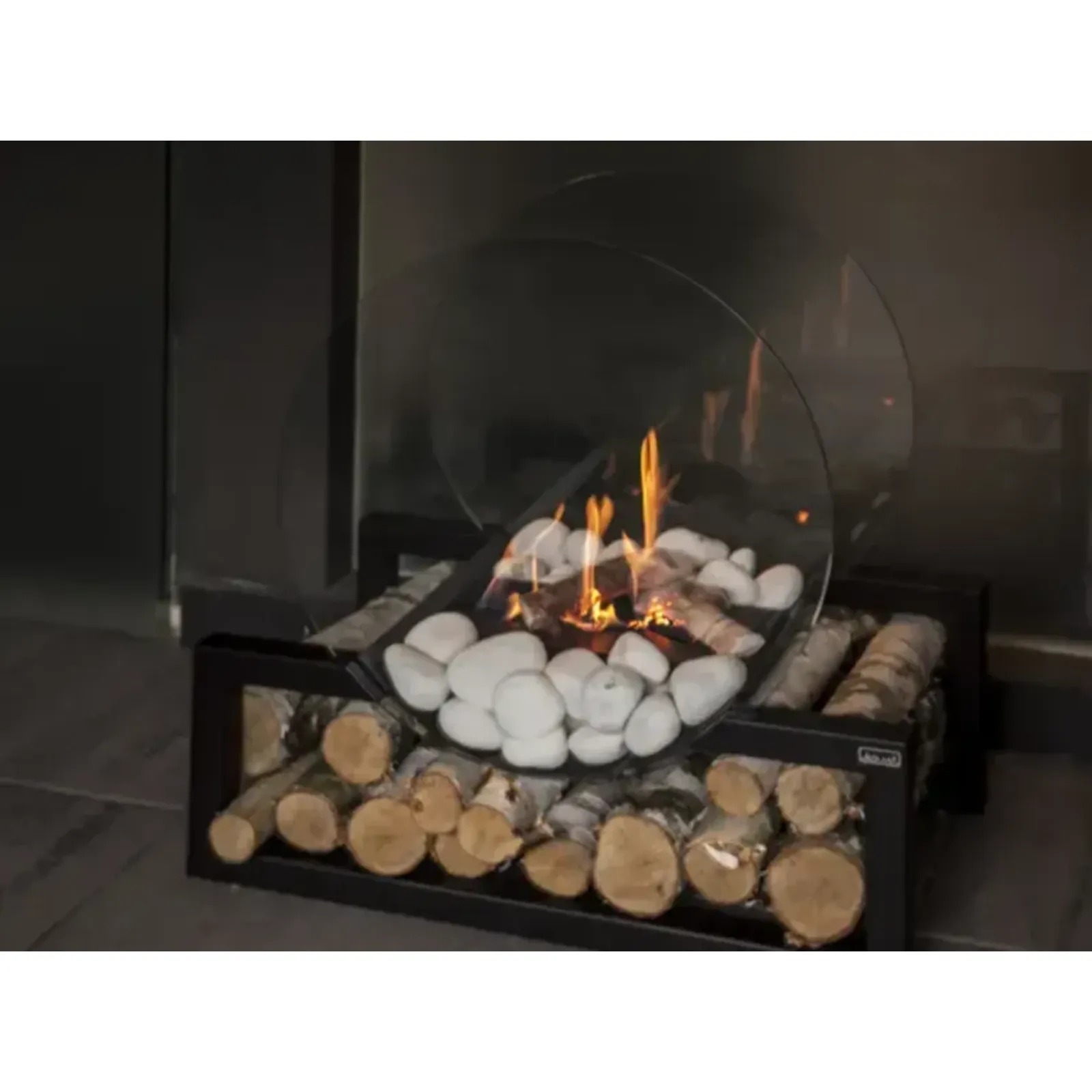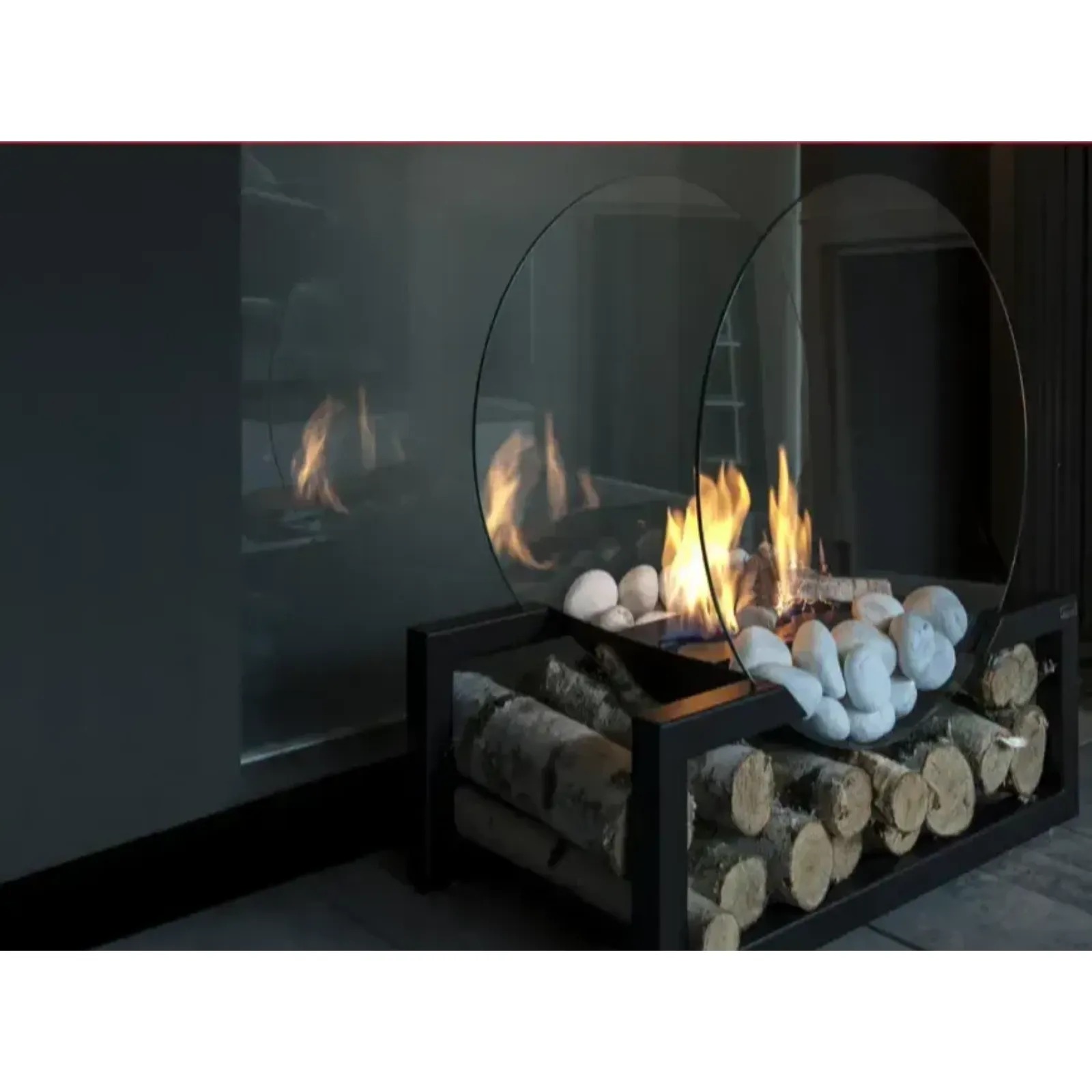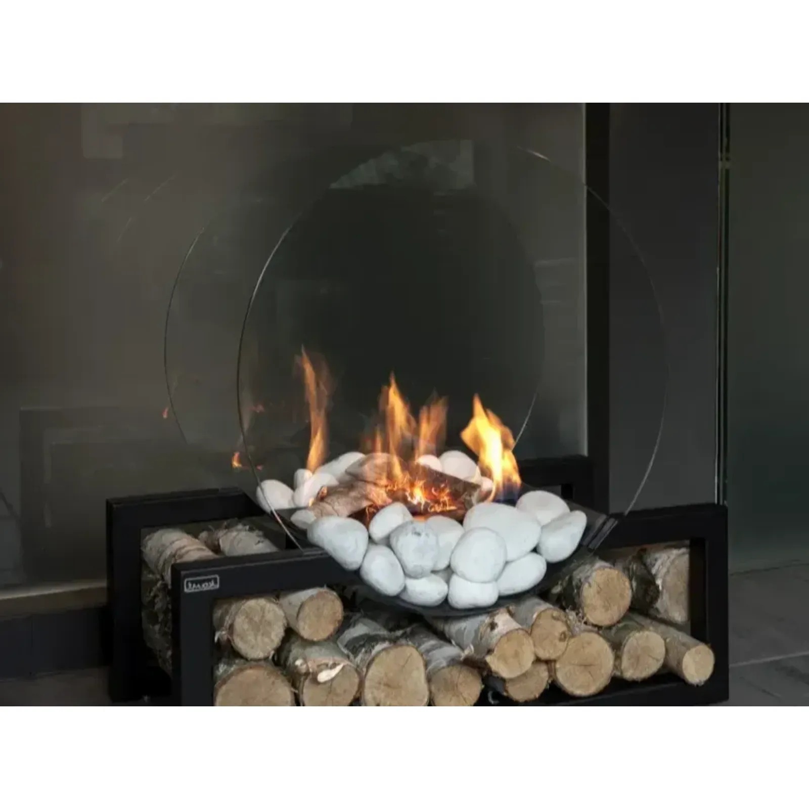 - eleganckie przeszklenia – biokominek wyposażony jest w dwie duże, koliste szyby, które stabilizują płomień i nadają mu nowoczesny wygląd,