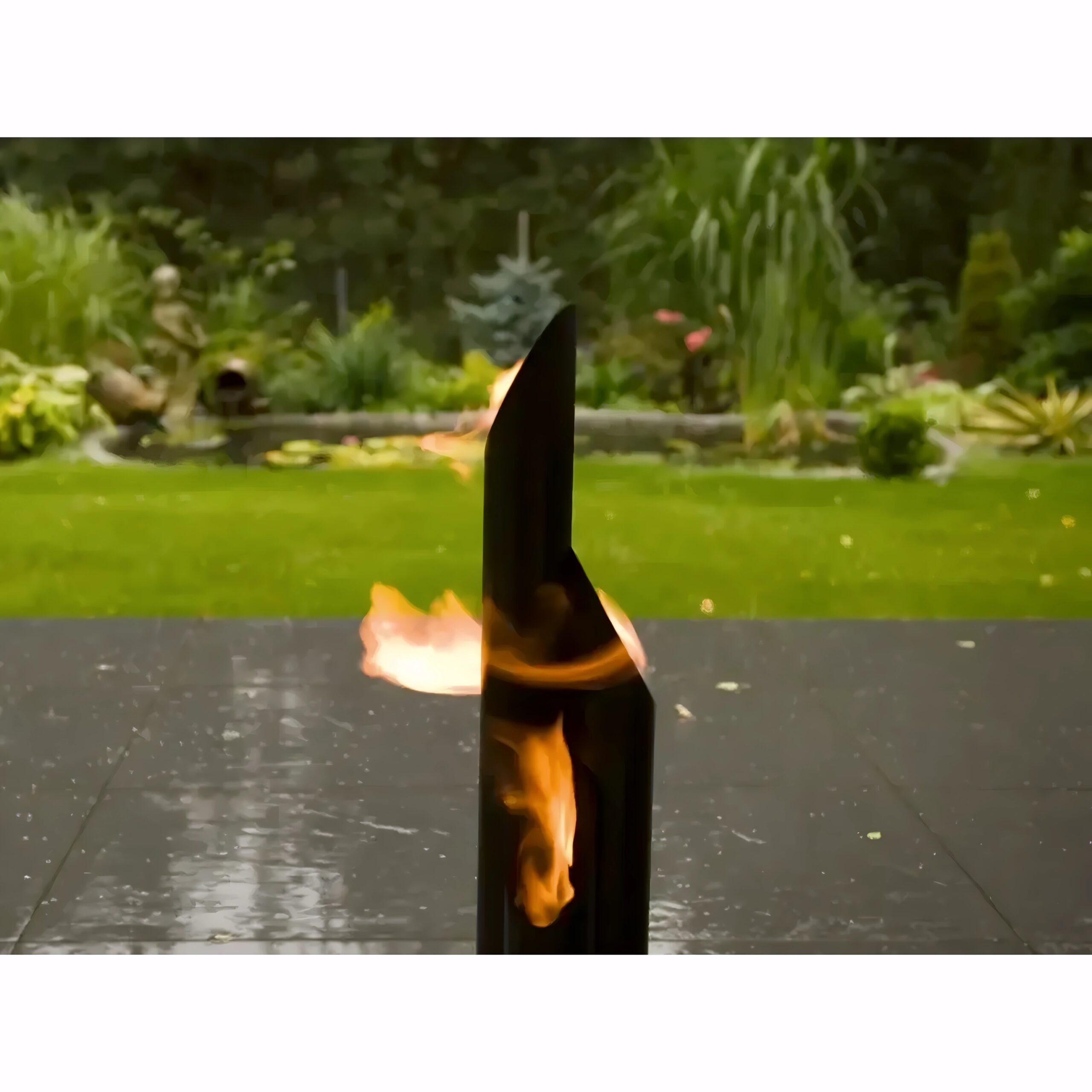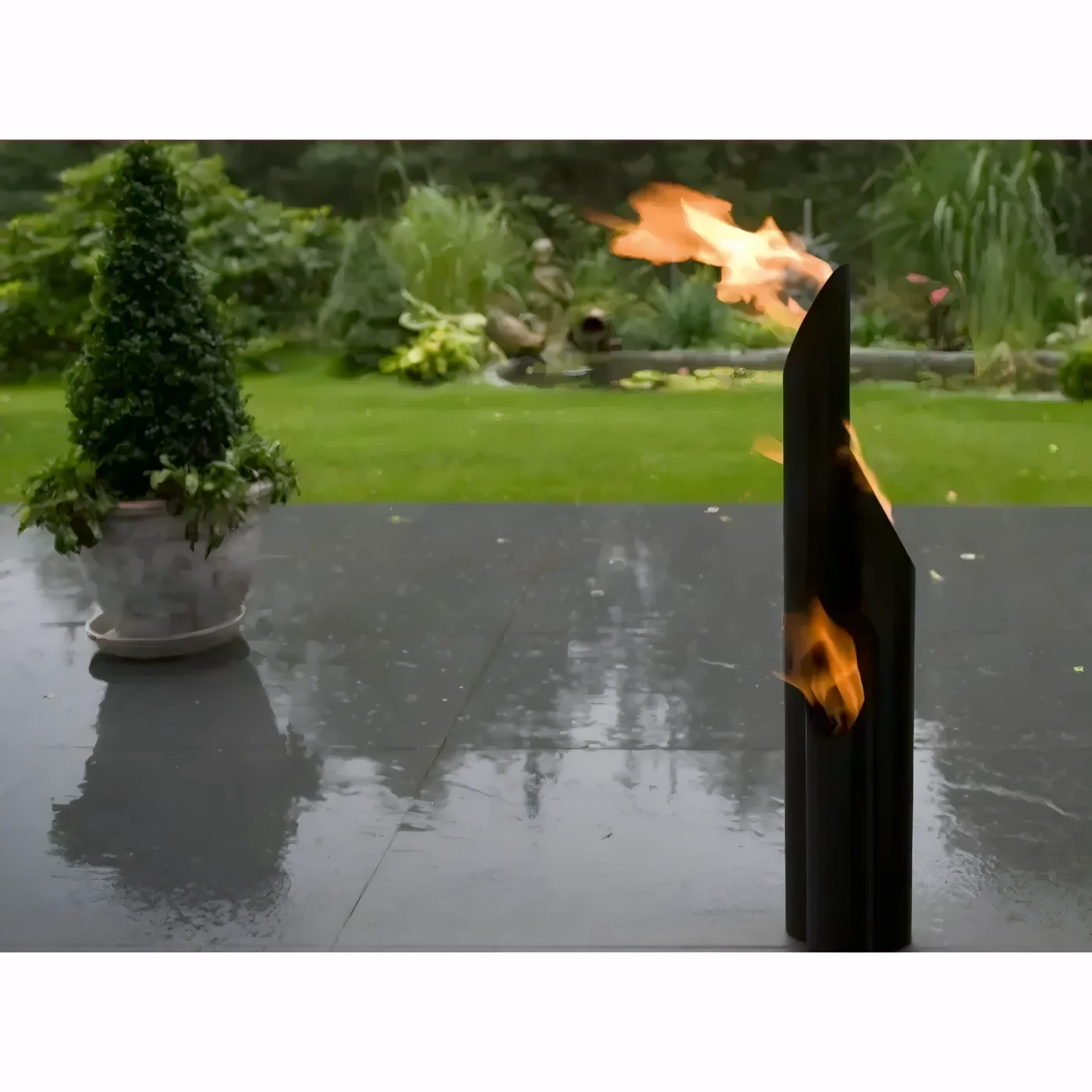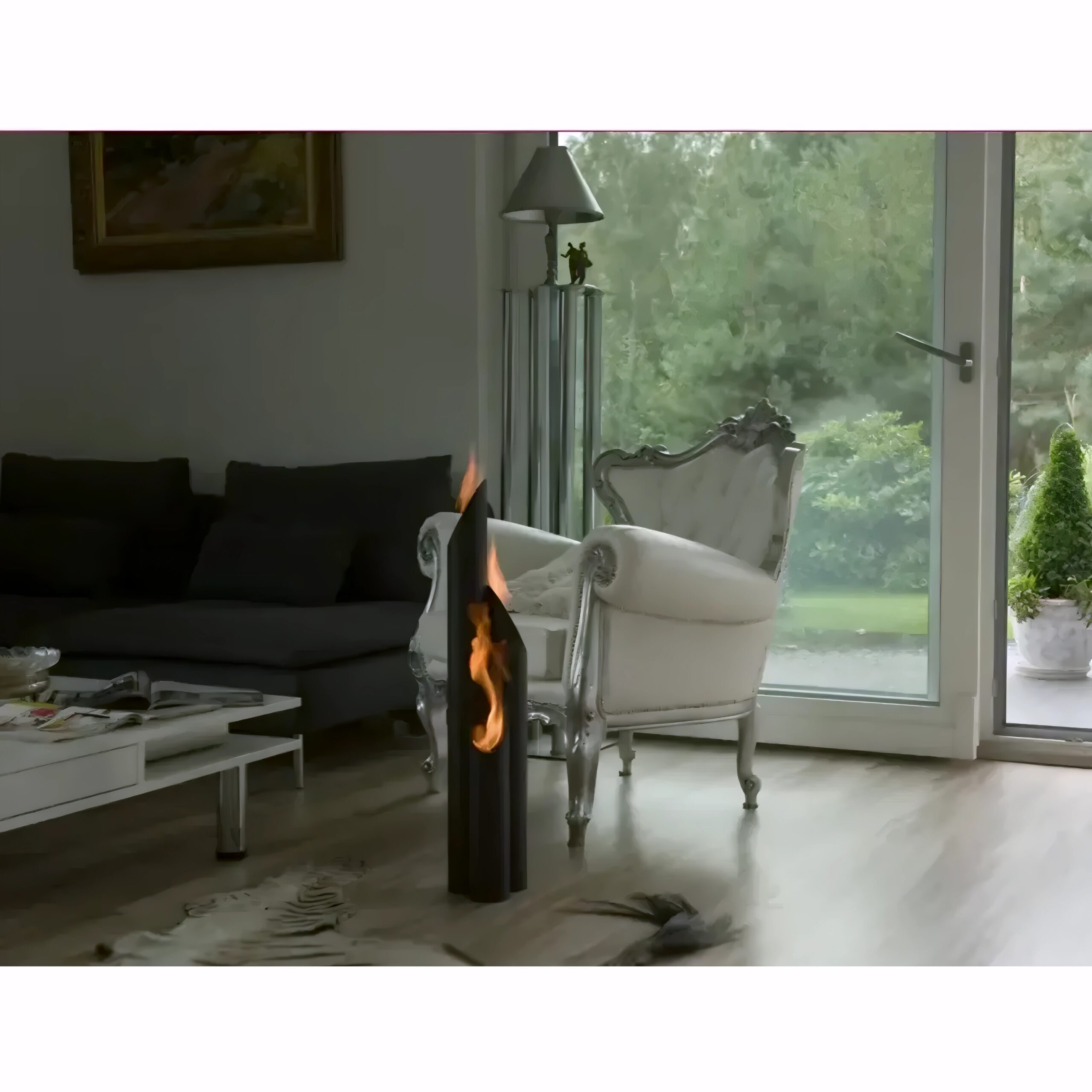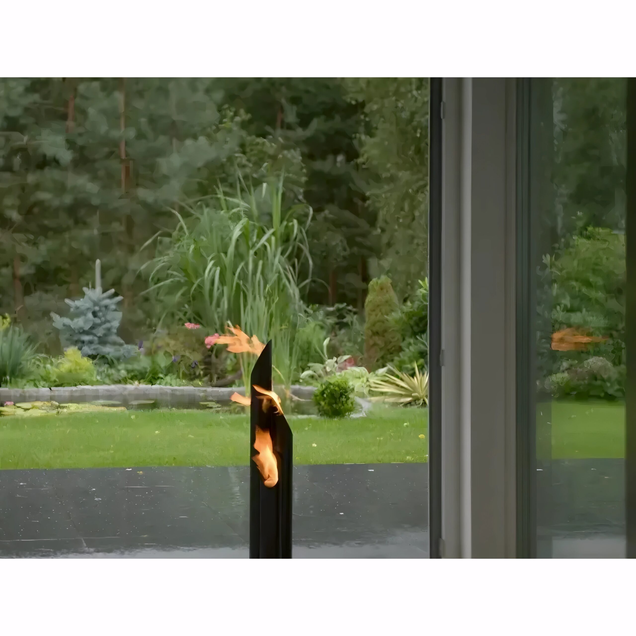 Model Cumbal Mini to elegancki biokominek wolnostojący o kompaktowych wymiarach, który idealnie łączy cechy nowoczesnej lampy na biopaliwo z funkcjonalnością biokominka dekoracyjnego, stanowiąc doskonałe rozwiązanie do oryginalnej aranżacji wnętrz domowych i komercyjnych. Niewielki, minimalistyczny design oraz smukła, wolnostojąca konstrukcja sprawiają, że znakomicie sprawdza się na stołach, komodach czy jako subtelny akcent na podłodze, stając się unikalnym elementem dekoracyjnym. Konstrukcja wykonana jest z wytrzymałej stali w kolorze czarnym. Wnętrze kryje trzy różniące się wysokością palniki, co pozwala na stworzenie dynamicznego układu płomieni i udekorowanie niemal każdego miejsca, stanowiąc intrygujący detal wizualny.  Mimo swojej solidnej podstawy, ten mobilny biokominek można łatwo przenieść, co pozwala na szybką zmianę klimatu i cieszenie się urokiem ognia w dowolnym, wybranym miejscu w domu, biurze lub ogrodzie.