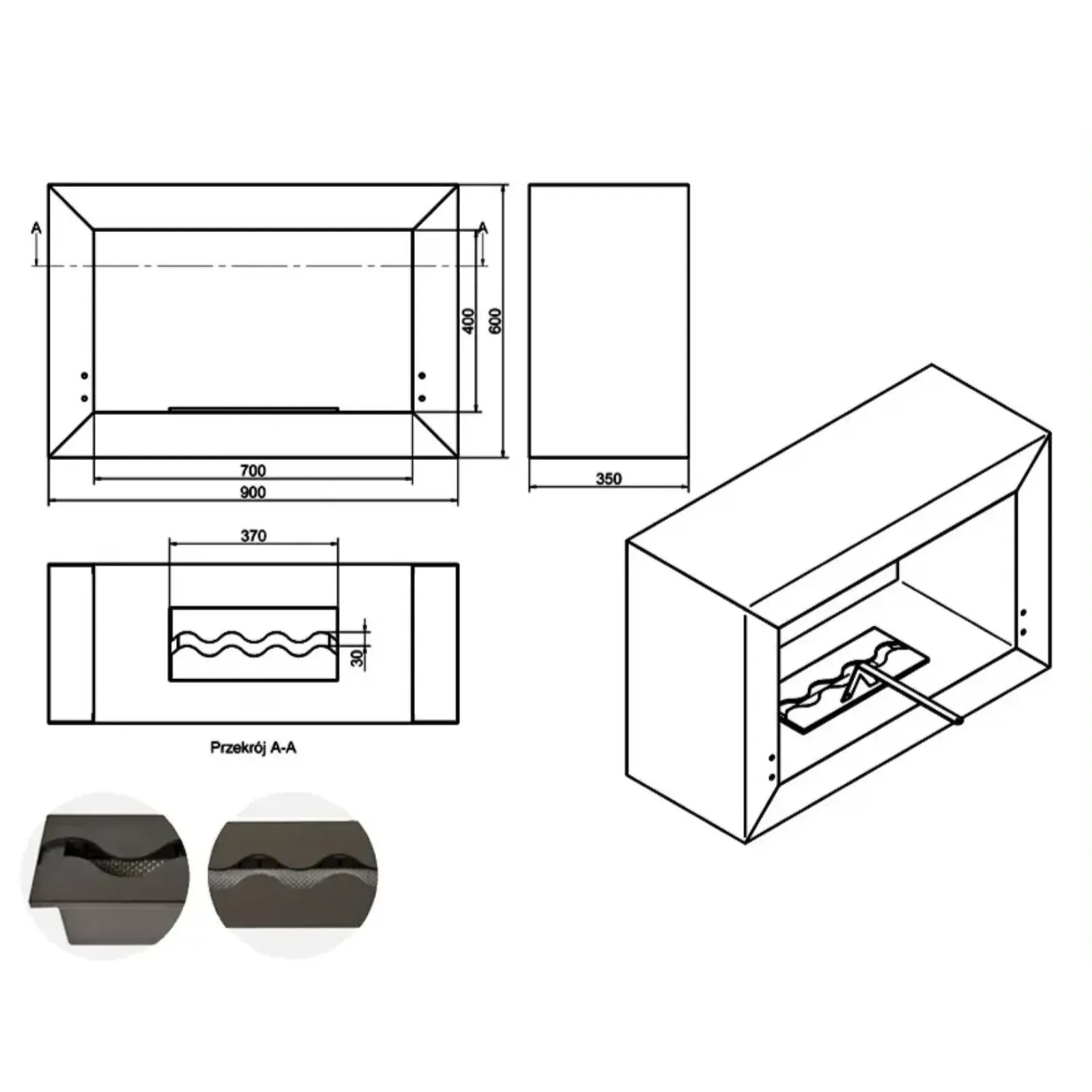Obudowa Katami wykonana jest ze stalowej blachy o grubości 1,5 mm, malowanej proszkowo farbą termoodporną w kolorze czarnym półmatowym – zapewniając trwałość, odporność na temperaturę i estetyczne wykończenie. Prosta, geometryczna forma oraz otwarte przelotowe palenisko umożliwiają obserwację płomienia z dwóch stron, dodając atmosferze lekkości i harmonii. To idealny model dla osób, które pragną wprowadzić do wnętrza naturalny, żywy ogień w stylu nowoczesnym, ale bez skomplikowanej instalacji kominkowej.