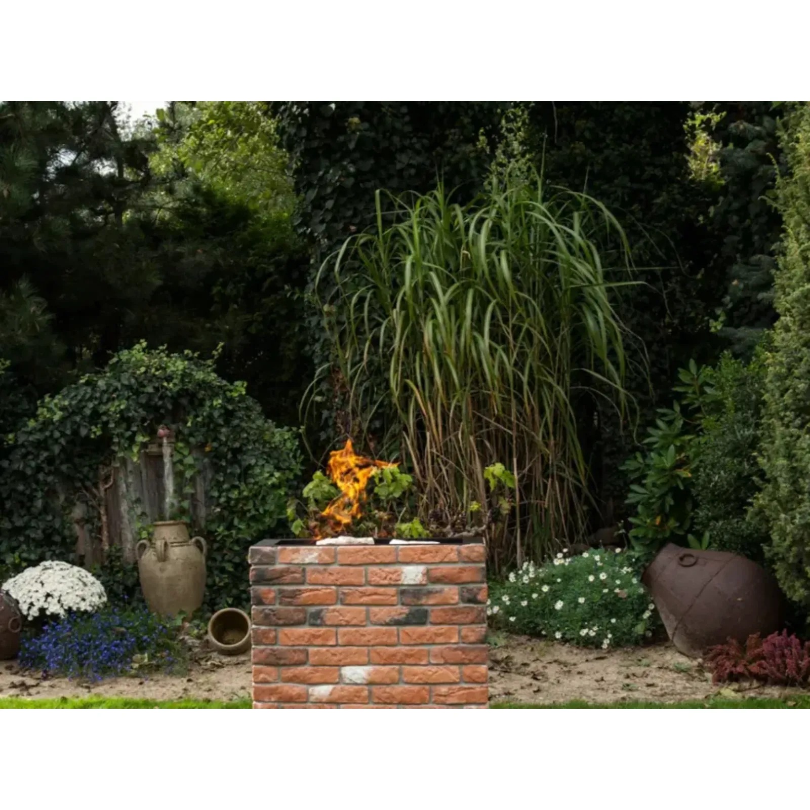 Obudowa wykonana jest z ceramiki, którą uformowano i wybarwiono tak, aby do złudzenia przypominała starą, naturalnie postarzaną cegłę. Dzięki temu biokominek zyskuje wyjątkowy charakter i wprowadza do przestrzeni ciepły, autentyczny klimat ogniska. Konstrukcja jest odporna na warunki atmosferyczne, stabilna i w pełni bezpieczna, co pozwala korzystać z niej zarówno w salonie, sypialni czy łazience, jak i na tarasie lub w ogrodzie.