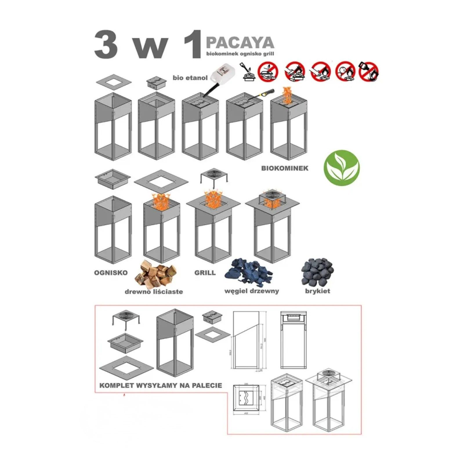 • wielofunkcyjne urządzenie typu 3 w 1 łączy w sobie funkcje ekologicznego biokominka na bioetanol, tradycyjnego kominka na drewno oraz praktycznego grilla z płytą i nadstawką,