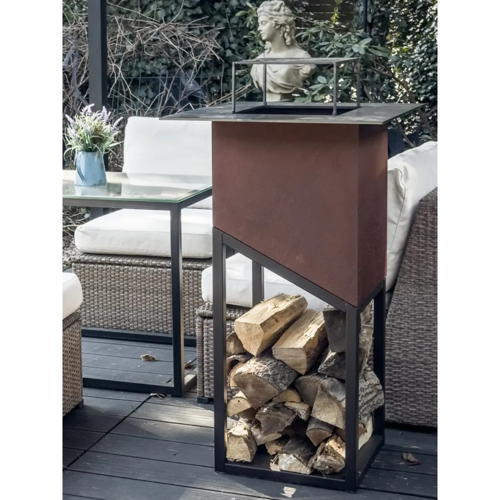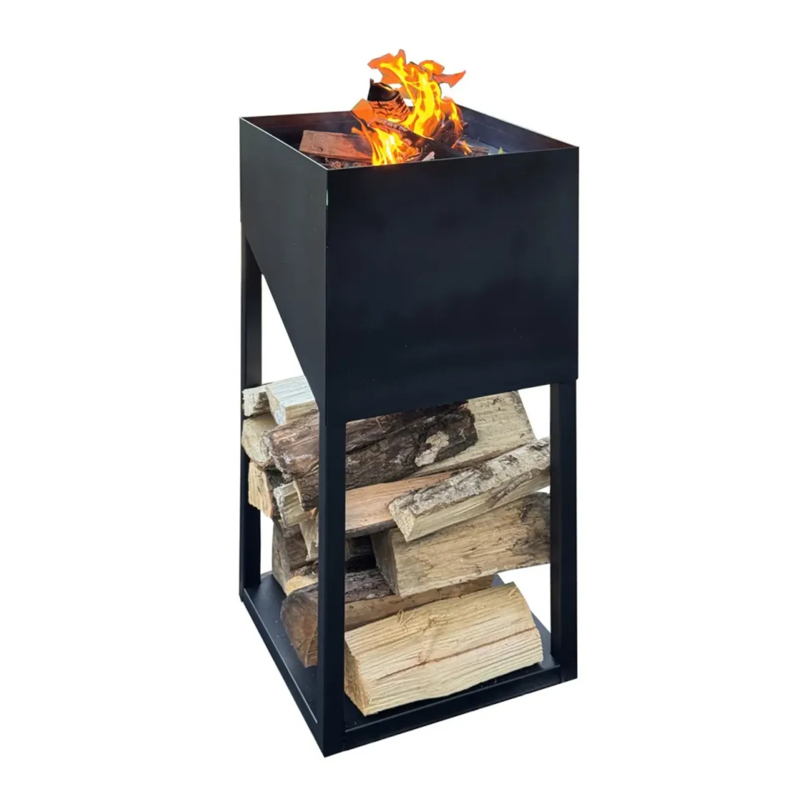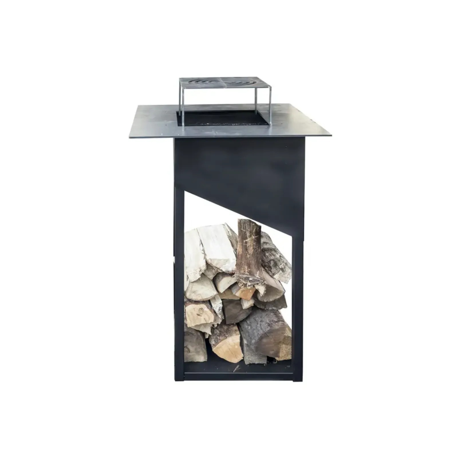 Obudowa modelu Pacaya wykonana jest z wytrzymałej stali o grubości 1.5 mm, malowanej proszkowo na kolor czarny półmatowy. Zastosowana farba jest w pełni odporna na warunki atmosferyczne, co gwarantuje trwałość i estetyczny wygląd przy częstym użytkowaniu na zewnątrz, na balkonie czy tarasie. Przemyślana konstrukcja bryły uwzględnia w dolnej części praktyczne i przestronne miejsce na drewno, które stanowi zarówno element dekoracyjny, jak i wygodny schowek na opał.