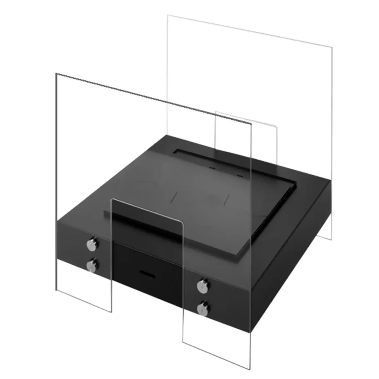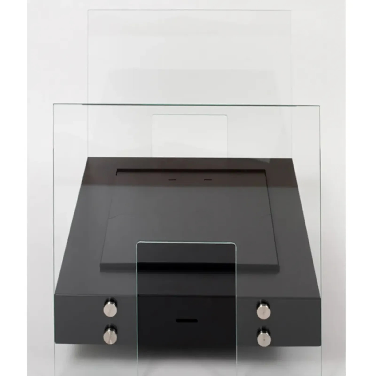 Konstrukcja biokominka składa się ze stalowej podstawy pod biopalenisko i dwóch paneli z hartowanego szkła o grubości 6 mm, które zapewniają maksymalne bezpieczeństwo podczas użytkowania, chroniąc płomień i stabilizując jego kierunek. Przezroczyste tafle szkła nadają konstrukcji lekkości i elegancji, eksponując ogień z każdej strony i podkreślając jego naturalne piękno.
