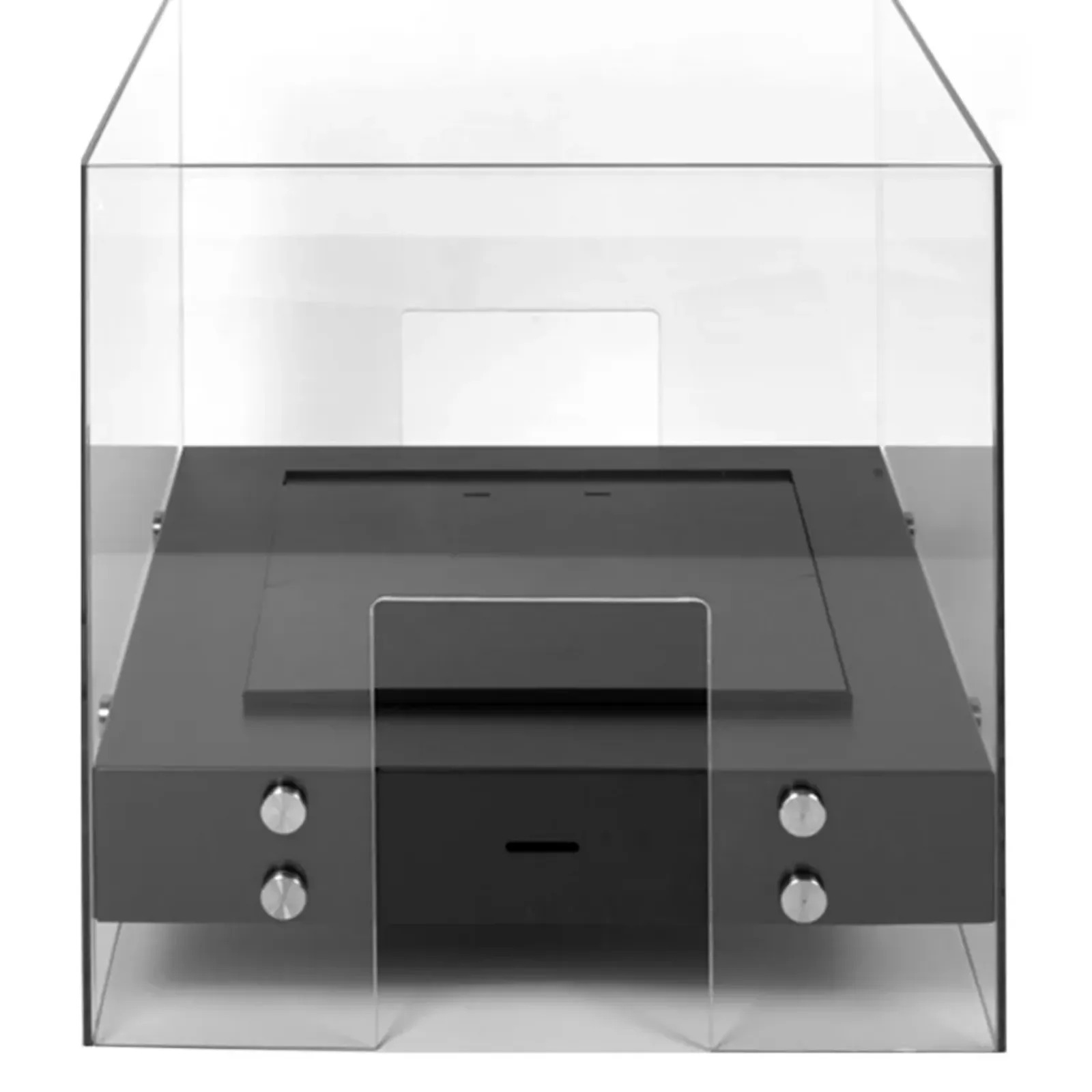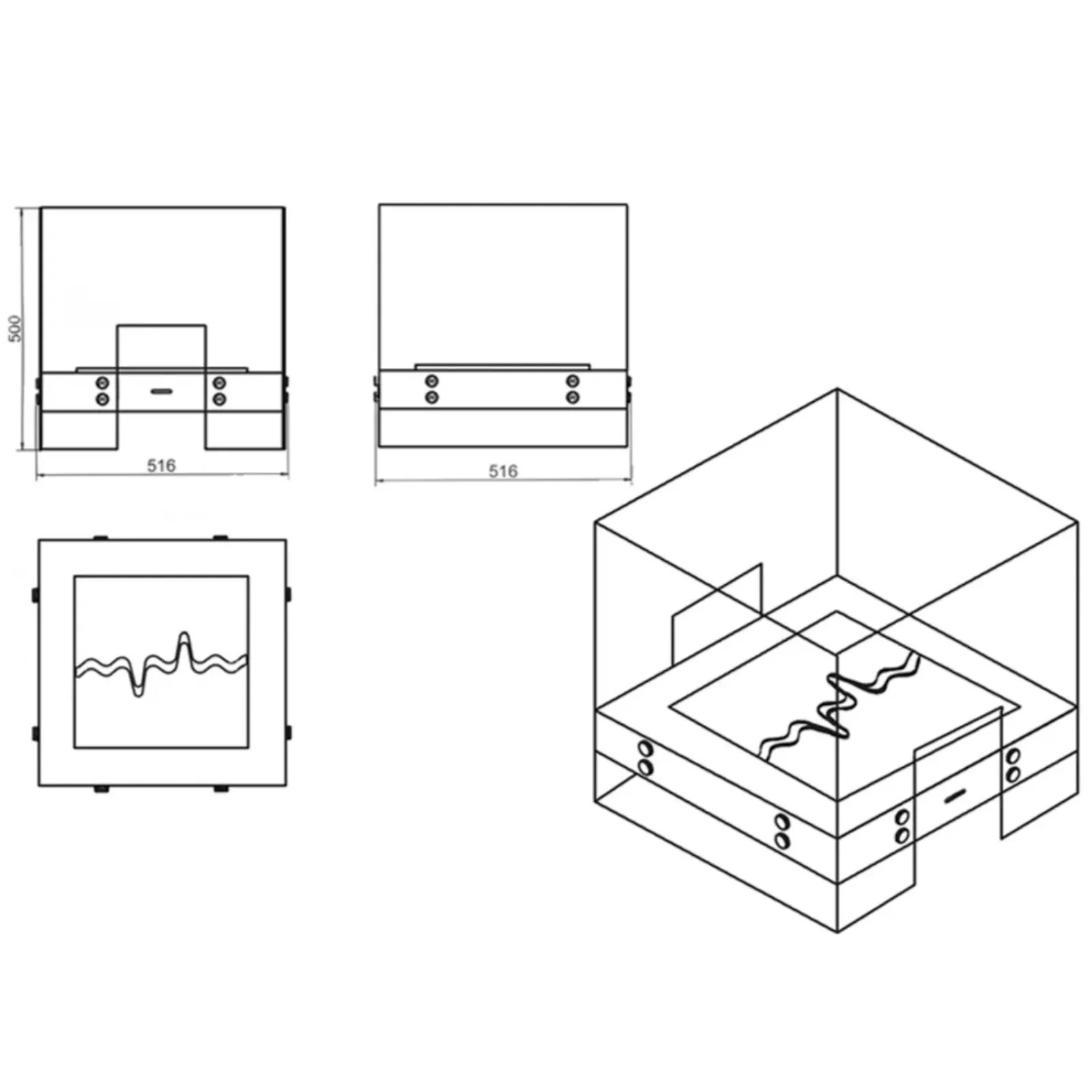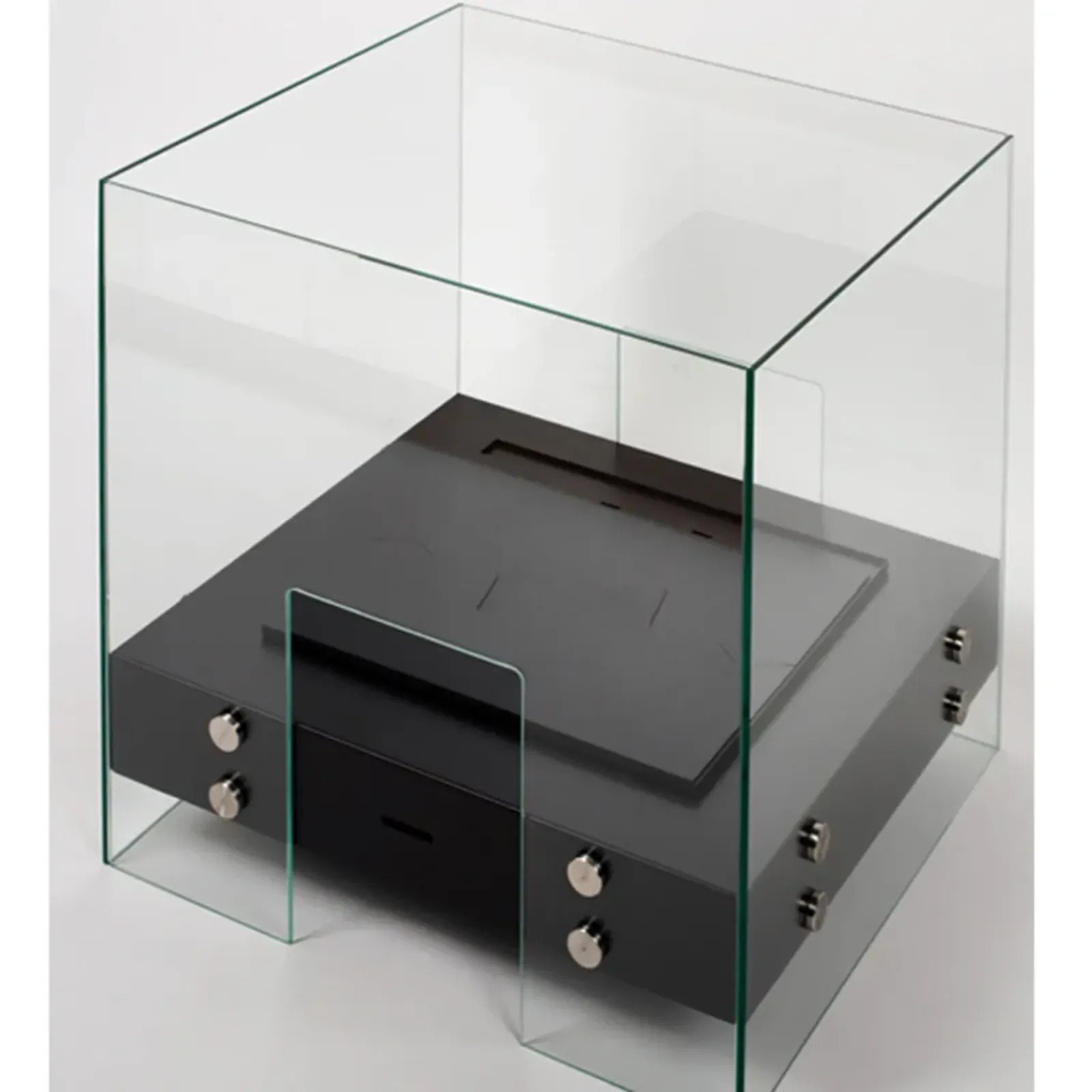 Konstrukcja biokominka składa się ze stalowej podstawy pod biopalenisko i czterech paneli z hartowanego szkła o grubości 6 mm, które zapewniają maksymalne bezpieczeństwo podczas użytkowania, chroniąc płomień i stabilizując jego kierunek. Przezroczyste tafle szkła nadają konstrukcji lekkości i elegancji, eksponując ogień z każdej strony i podkreślając jego naturalne piękno.