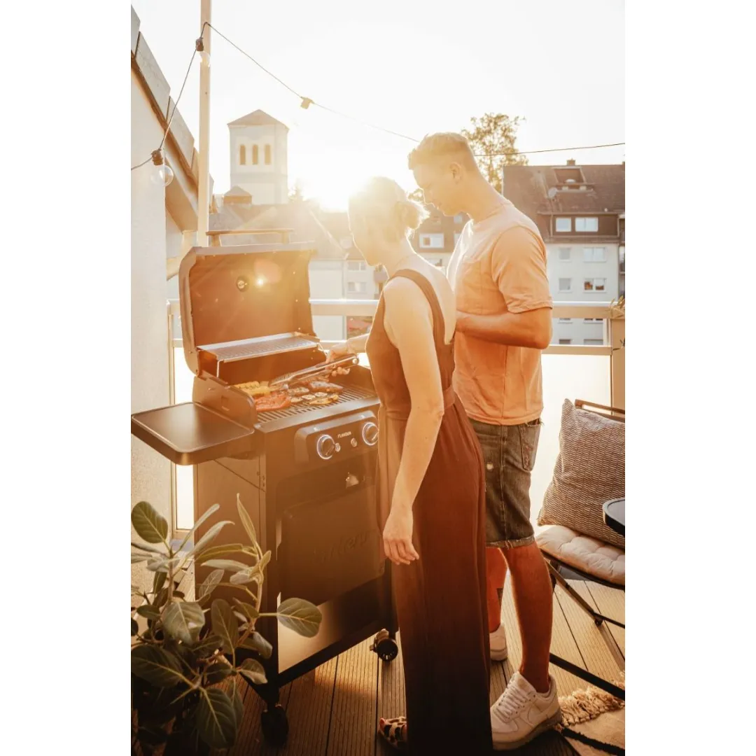 Grill Enders eFlavour 2 Turbo został wyposażony w żeliwny ruszt o wymiarach 50 x 39 cm, co daje imponującą powierzchnię grillowania wynoszącą 1950 cm². Nad głównym rusztem znajduje się dodatkowy ruszt ze stali nierdzewnej, który pozwala na podgrzewanie potraw i utrzymywanie ich w cieple. Urządzenie posiada trzy elementy grzewcze o mocy 1,5 kW każdy, a jego łączna moc wynosi 3 kW. W pokrywie umieszczono termometr, umożliwiający stałą kontrolę temperatury bez konieczności otwierania grilla. Podświetlane LED-em pokrętła ułatwiają obsługę, a praktyczne rozwiązania, takie jak składane półki boczne, cztery skrętne kółka oraz miejsce na akcesoria w dolnej części wózka, zapewniają wygodę użytkowania i mobilność. Odkryj nowy wymiar grillowania z elektrycznymi grillami Enders i sprawdź, co jeszcze mają do zaoferowania!