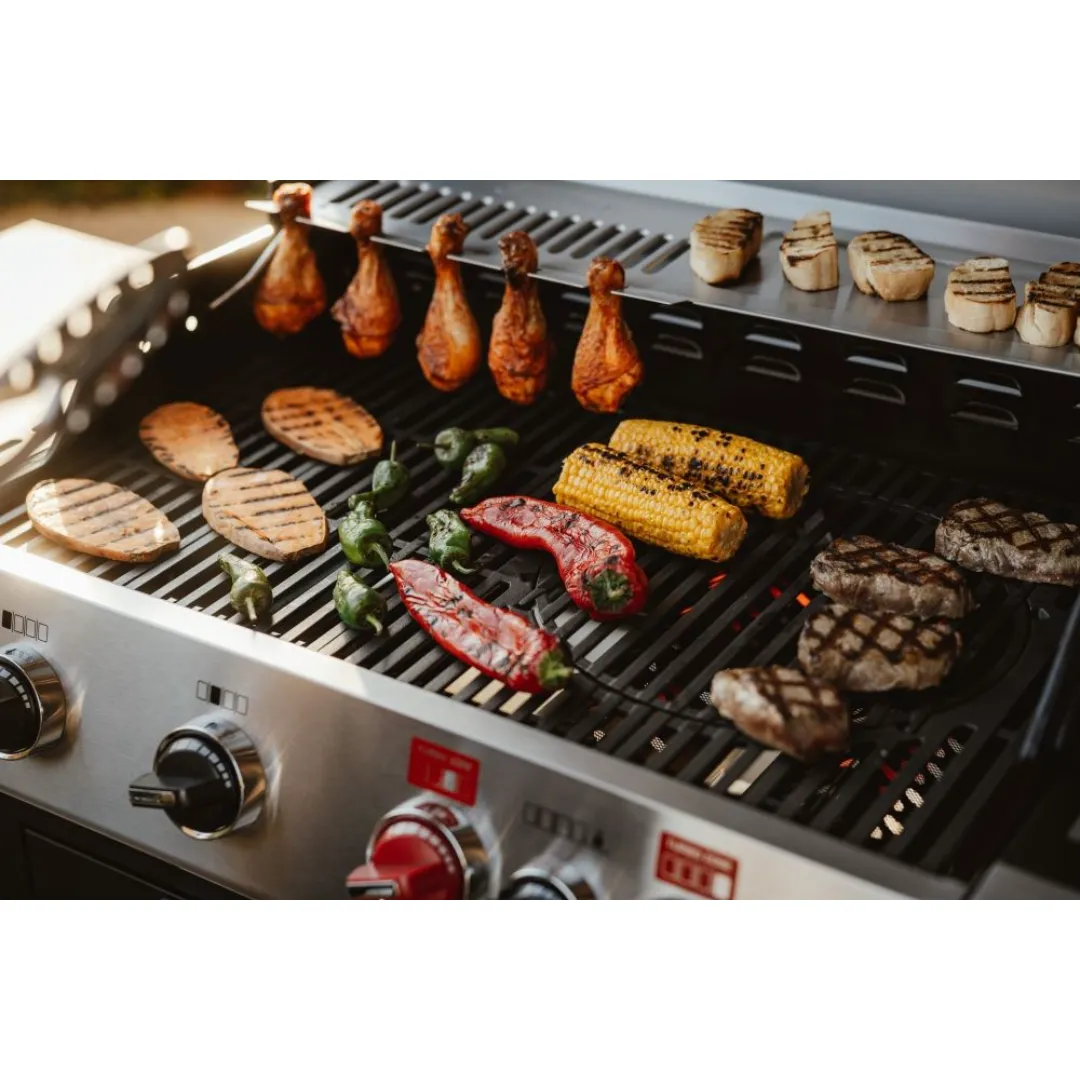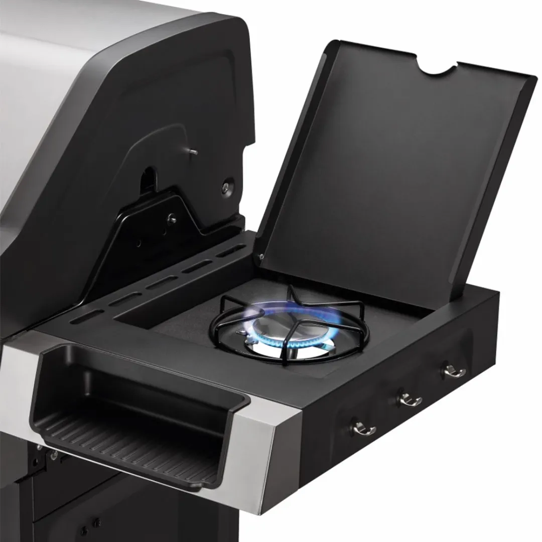 Dodatkowy palnik boczny o mocy 3,15 kW otwiera kolejne możliwości – pozwala równolegle gotować zupy, przygotowywać sosy lub podgrzewać dodatki. Gdy nie jest używany, złożony tworzy wygodną półkę roboczą. W pokrywie zamontowano termometr, który na bieżąco informuje o temperaturze wewnątrz grilla, a ruszt do podgrzewania pieczywa i potraw dopełnia praktyczność całego zestawu.