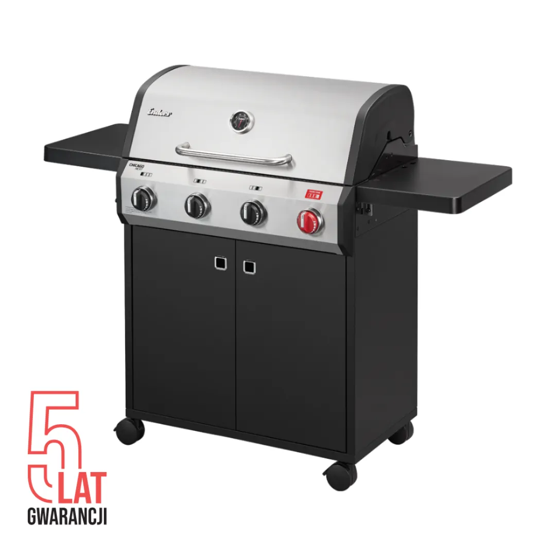 Dwuścienna pokrywa wykonana ze stali nierdzewnej oraz malowanej proszkowo stali, a także komora spalania z emaliowanej stali, zapewniają wyjątkową trwałość i odporność na warunki atmosferyczne, gwarantując długotrwałe zadowolenie z użytkowania. Zapłon piezoelektryczny oraz wbudowany termometr w pokrywie ułatwiają kontrolowanie procesu grillowania, umożliwiając uzyskanie doskonałych rezultatów bez wysiłku. Grill Enders Chicago Next 3 R Turbo oferuje również wygodne rozwiązania, takie jak szafka na butlę gazową 11 kg oraz wyjmowaną szufladę na tłuszcz. Dodatkowo, składane boczne półki zwiększają funkcjonalność grilla i umożliwiają zaoszczędzenie miejsca podczas przechowywania. Dzięki kompaktowym wymiarom oraz czterem skrętnym kołom, grill doskonale pasuje do każdej przestrzeni ogrodowej, oferując nie tylko doskonałe efekty smakowe, ale również elegancki wygląd i pełną mobilność.