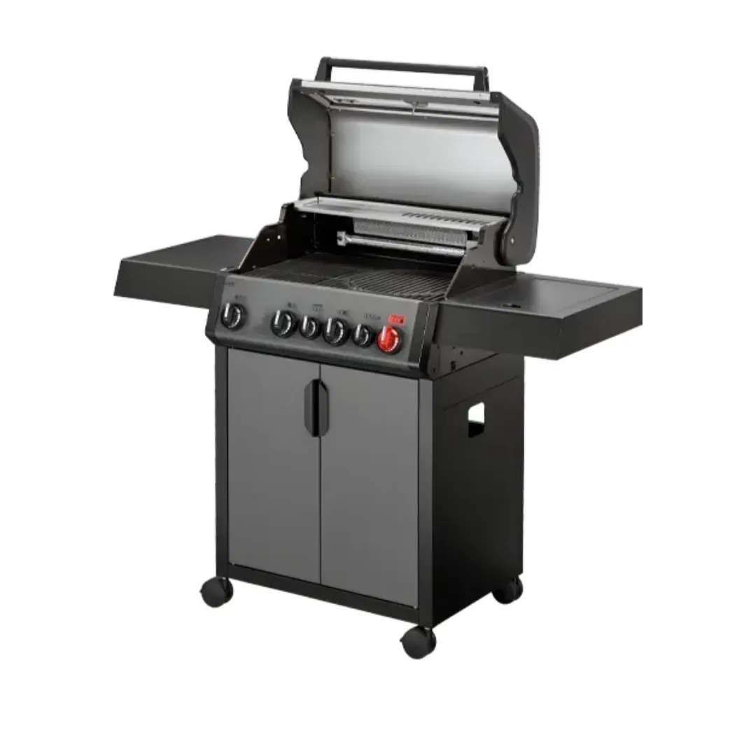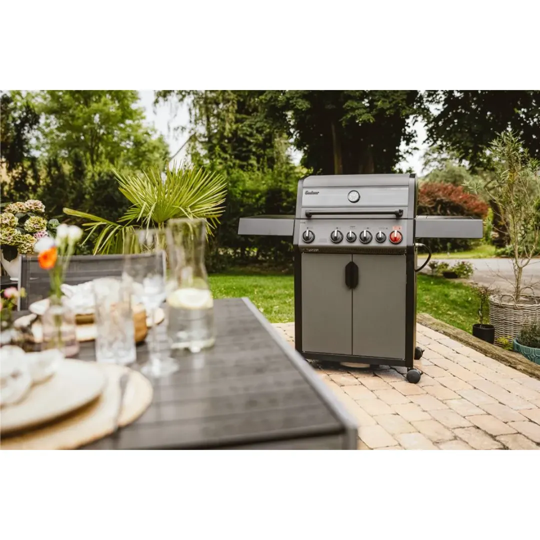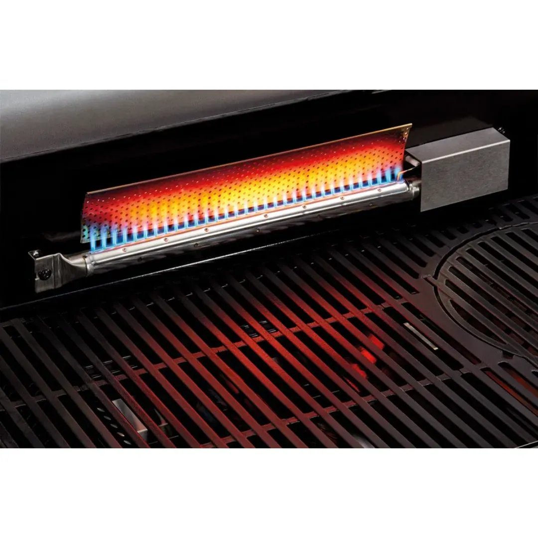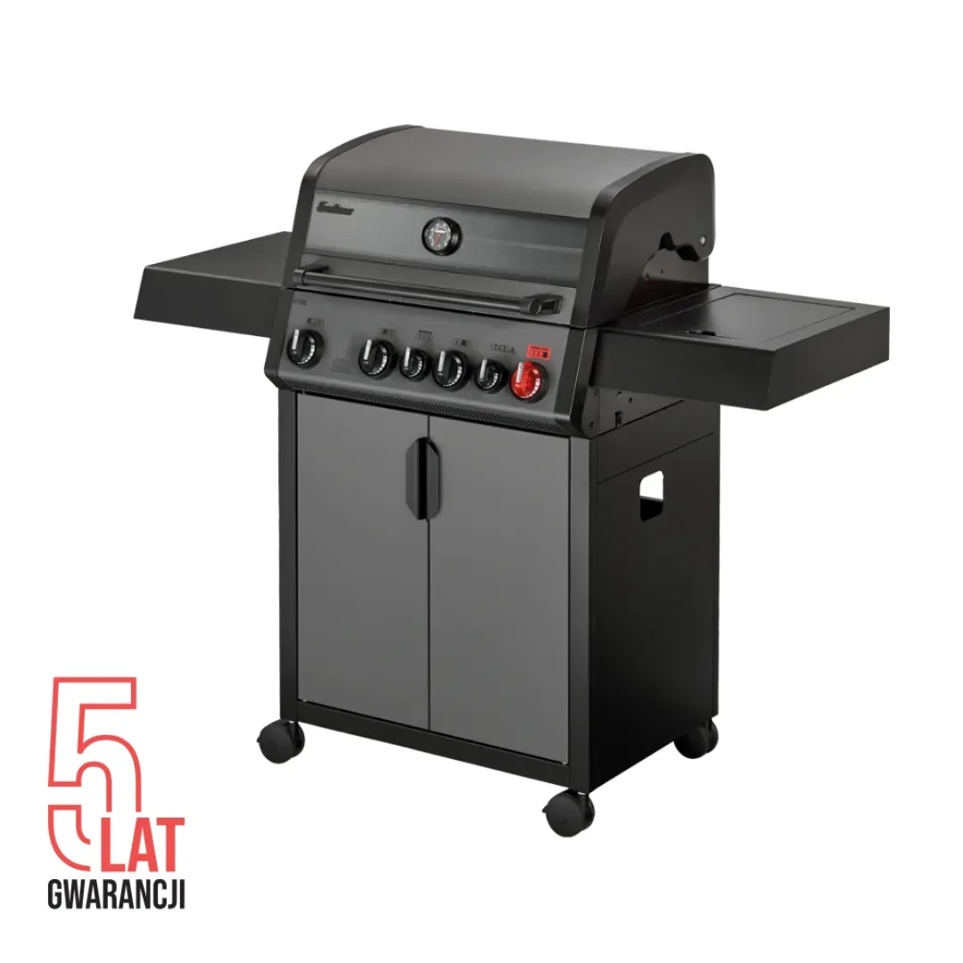 Urządzenie wyposażono w cztery palniki ze stali nierdzewnej o łącznej mocy 13 kW, które gwarantują wysoką wydajność i równomierne rozprowadzanie ciepła. Dodatkowy palnik rożna infrared o mocy 3,5 kW umożliwia przygotowywanie soczystych, pełnych aromatu potraw, a boczny palnik (2,9 kW) pozwala gotować sosy lub dusić warzywa bez konieczności schodzenia z ogrodu do kuchni.