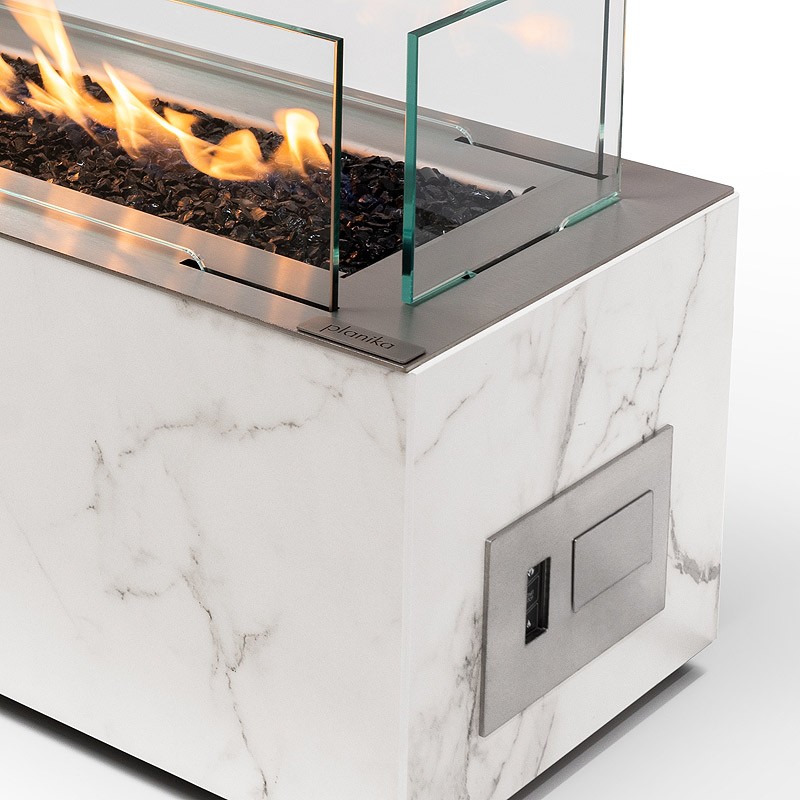 Skrzynia jest wykonana z wysoko cenionej powierzchni Dekton od Cosentino – 12-milimetrowego ultrakompaktowego materiału wykonanego z ceramicznych spieków, kwarcu i szkła. Jego wysoka wydajność oferuje odporność na zarysowania i plamy oraz jest znane z wytrzymałości na wysokie temperatury. Ma elegancki matowy wygląd marmuru Laurent, dzięki czemu stanowi ciekawą dekorację w każdej przestrzeni. Palnik posiada eleganckie, ale solidne wykończenie ze stali nierdzewnej z dekoracyjnymi czarnymi szklanymi kamykami.