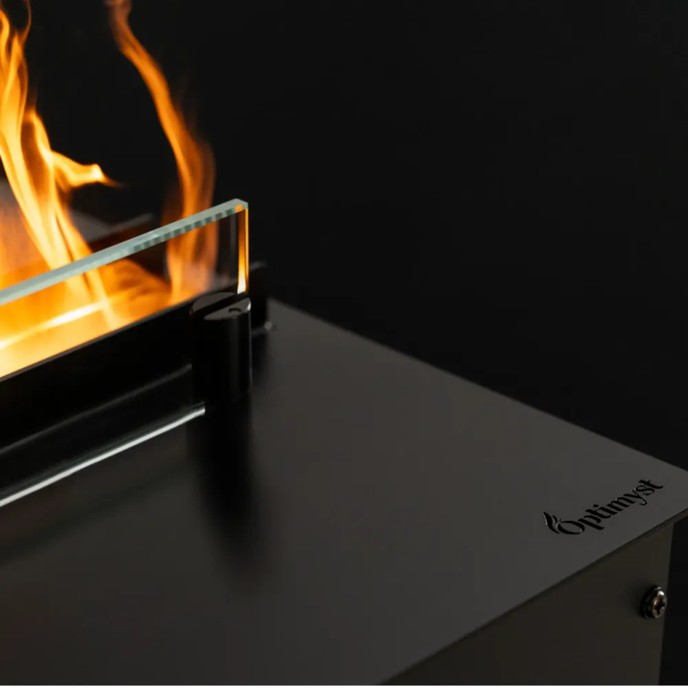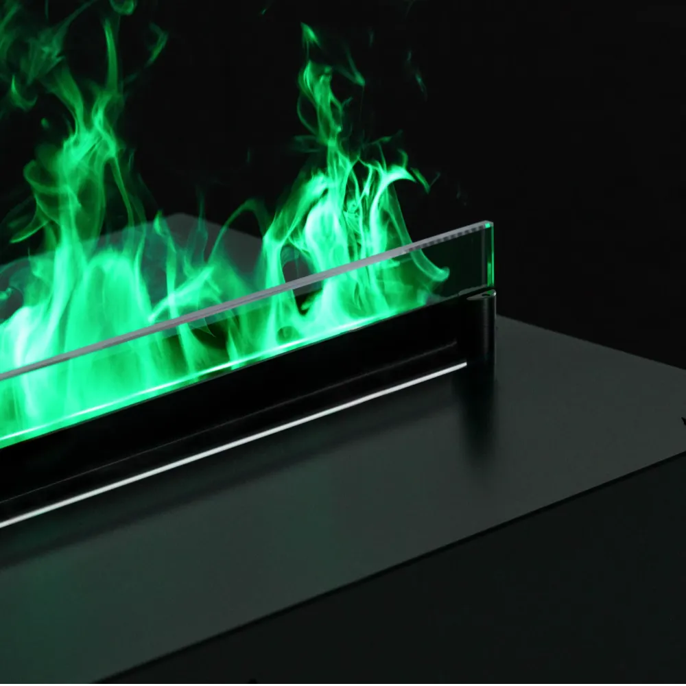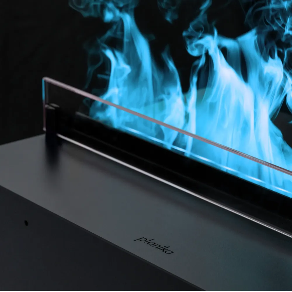 Cool Flame 500 See-Through Fireplace wykorzystuje zaawansowaną technologię Optimyst, która dzięki ultradźwiękowej atomizacji wody generuje drobne cząsteczki mgły. Te, podświetlane diodami LED, doskonale imitują naturalne płomienie i dym. Efekt wizualny jest tak przekonujący, że trudno go odróżnić od prawdziwego ognia. To rozwiązanie umożliwia cieszenie się atmosferą kominka w sposób bezpieczny, czysty i przyjazny dla środowiska. Odkryj kominki na parę wodną Planika i zachwyć się magią ognia powstałego z wody!