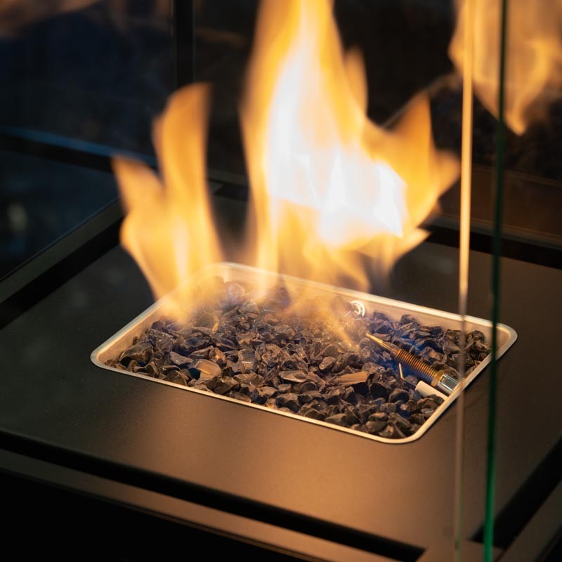 - Palenisko wypełnione eleganckimi kamieniami – w tym modelu to płomień odgrywa główną rolę