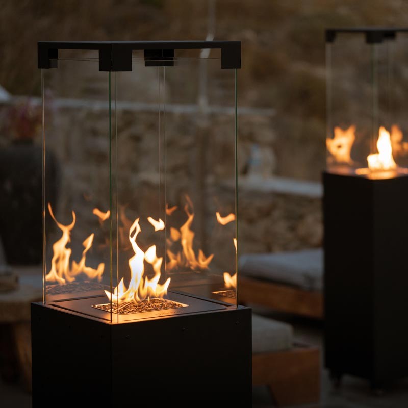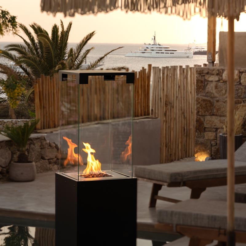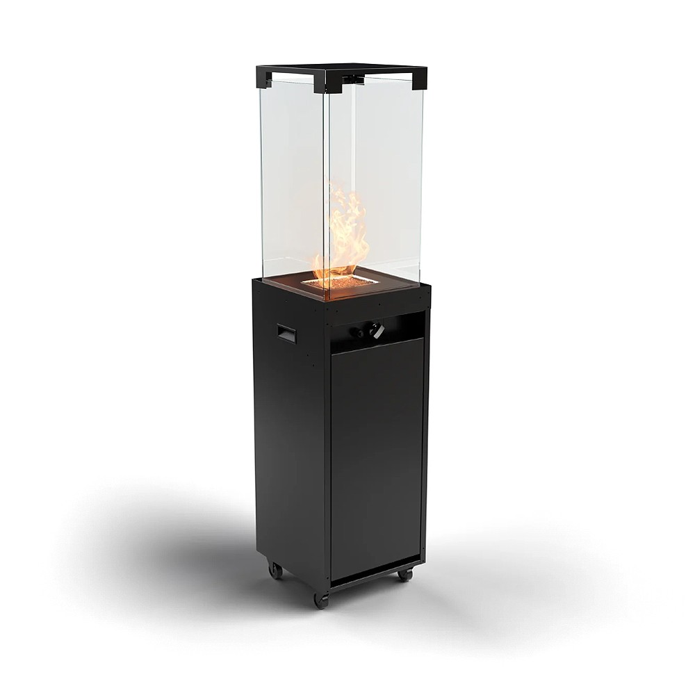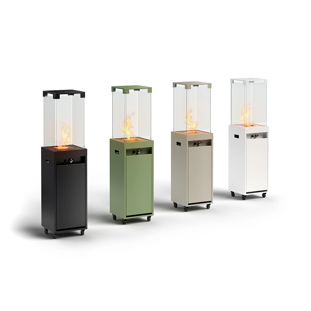 Ogrzewacz tarasowy Faro można umieścić w dowolnym miejscu! Ważne jest jednak, aby zachować bezpieczną odległość od materiałów łatwopalnych – co najmniej 0,3 m wokół urządzenia i 1 m nad nim. Biorąc pod uwagę, iż ten kominek gazowy wraz z kółkami ma 1,5 m wysokości, dach musi być na wysokości przynajmniej 2,5 metra.