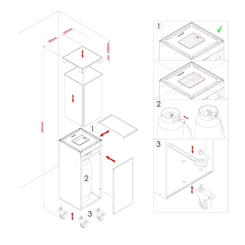 W ogrzewaczu mieści się maksymalnie butla o pojemności 11 kg, można umieścić w nim również zbiornik o mniejszej pojemności. Butla gazowa musi być dopasowana do dołączonego do ogrzewacza reduktora (1,5kg/h 37mbar LongTime) oraz średnicy węża podłączeniowego (Ø9mm). Jeśli butla gazowa ma inny rozmiar wlotu lub wymaga innego regulatora, należy wymienić dołączony regulator na odpowiedni (dostępny osobno na lokalnym rynku) bądź wymienić butlę na pasującą do dołączonych elementów podłączeniowych.