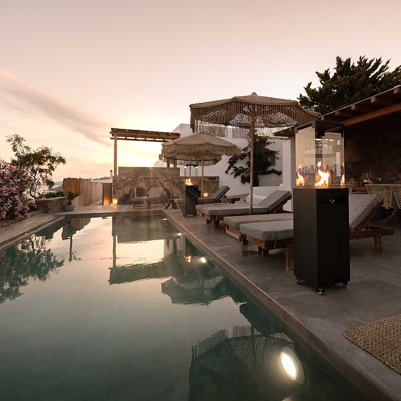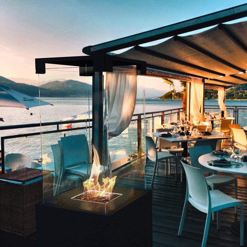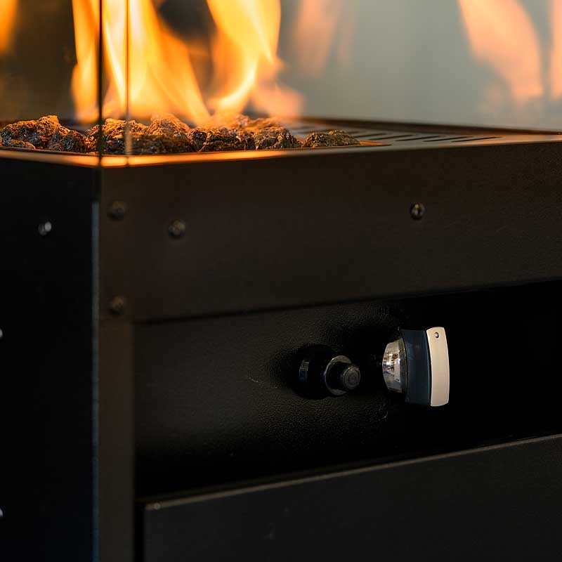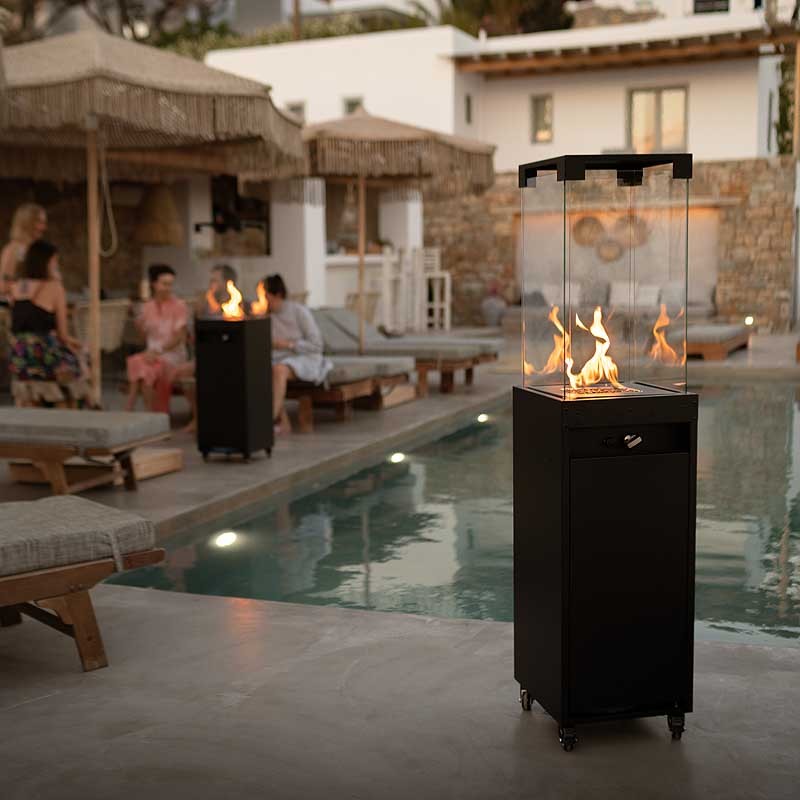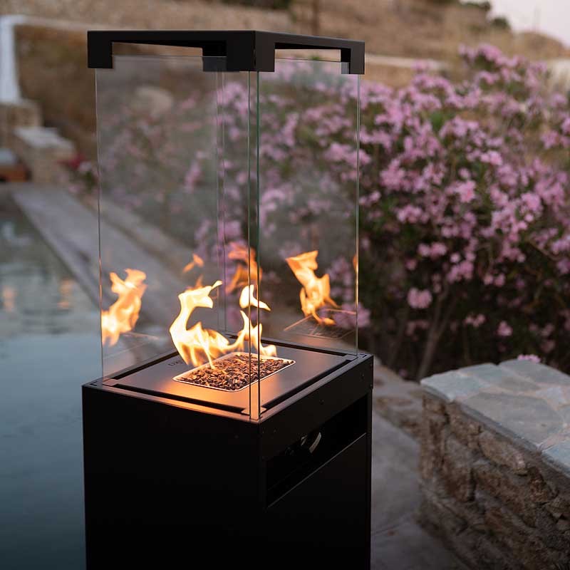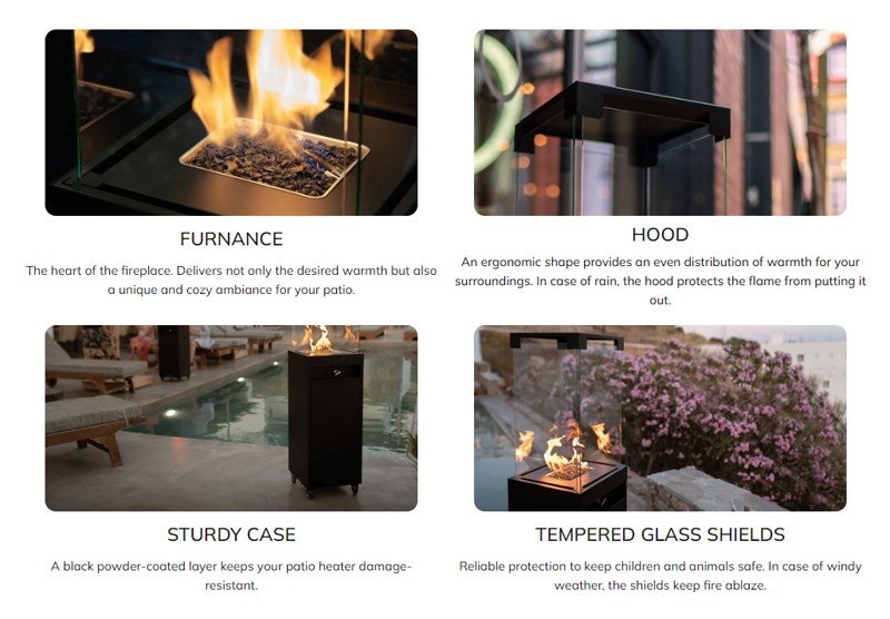 Szklane osłony i metalowy daszek chronią przed bezpośrednim dostępem do ognia i dodatkowo podkreślają blask płomienia. Dzięki bezpiecznemu i wydajnemu palnikowi ogrzewacz nie generuje dymu. Dedykowany pokrowiec zapewnia ochronę produktu podczas przechowywania i pomaga utrzymać czystość ogrzewacza.