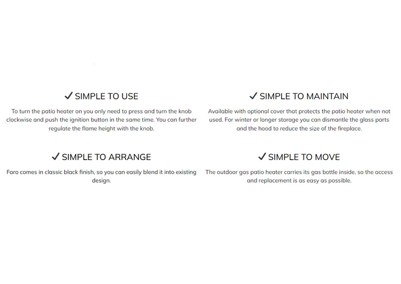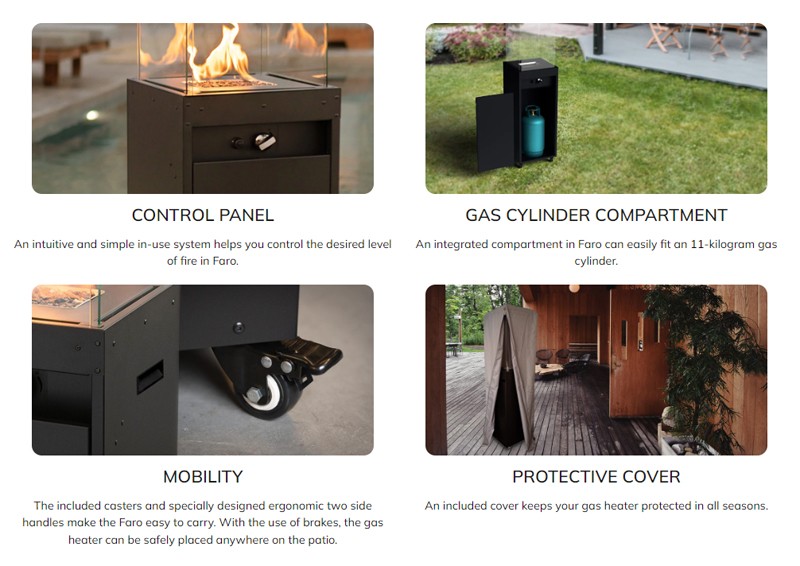 Faro posiada moc grzewczą 8kW. Najlepiej sprawdza się w zadaszonych miejscach osłoniętych od wiatru takich jak altany, pergole. Emituje ciepło równomiernie z czterech stron przez szyby oraz otwory w daszku.