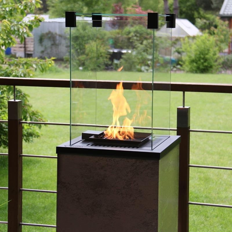 Przemyślana budowa urządzenia wpływa na bezpieczeństwo użytkowania. Butla z gazem ukryta jest w obudowie zamykanej na klucz. Płomień osłaniają szklane panele (ceramika żaroodporna stosowana również w tradycyjnych wkładach kominkowych), uniemożliwiając bezpośredni dostęp do otwartego ognia. Wbudowany sterownik pozwala na podziwianie gry płomieni pod całkowitą kontrolą. Zawór antyprzechyłowy, w razie przewrócenia urządzenia i czujnik termopary, w razie zdmuchnięcia płomienia automatycznie zatrzymają transport gazu do palnika. Ogrzewacz wyposażony jest w całkowicie bezpieczny i zaawansowany system automatycznego sterowania, który chroni przed niekontrolowanym wyciekiem paliwa.