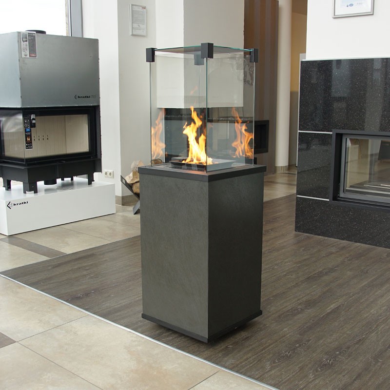 Przemyślana budowa urządzenia wpływa na bezpieczeństwo użytkowania. Butla z gazem ukryta jest w obudowie zamykanej na klucz. Płomień osłaniają szklane panele (ceramika żaroodporna stosowana również w tradycyjnych wkładach kominkowych), uniemożliwiając bezpośredni dostęp do otwartego ognia. Wbudowany sterownik pozwala na podziwianie gry płomieni pod całkowitą kontrolą. Zawór antyprzechyłowy, w razie przewrócenia urządzenia i czujnik termopary, w razie zdmuchnięcia płomienia automatycznie zatrzymają transport gazu do palnika. Ogrzewacz wyposażony jest w całkowicie bezpieczny i zaawansowany system automatycznego sterowania, który chroni przed niekontrolowanym wyciekiem paliwa.