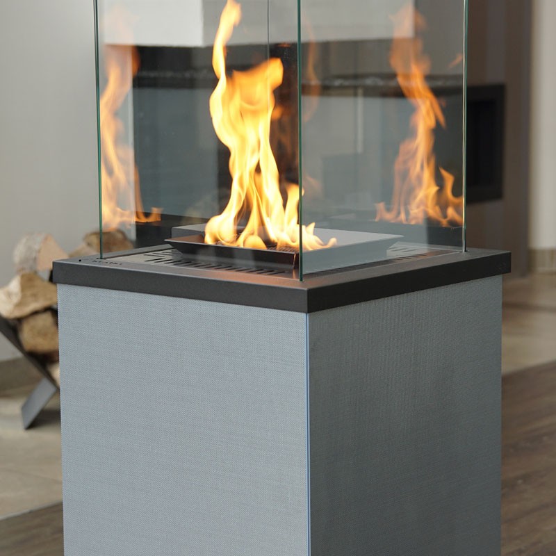 Szklane osłony nie tylko stabilizują płomień, ale również chronią przed bezpośrednim dostępem do ognia i potęgują jego blask. Dzięki bezpiecznemu i wydajnemu palnikowi ogrzewacz nie generuje dymu, przez co szyby nie wymagają kłopotliwego czyszczenia. Dedykowany pokrowiec zapewnia ochronę kominka podczas przechowywania i pomaga utrzymać go w czystości.
