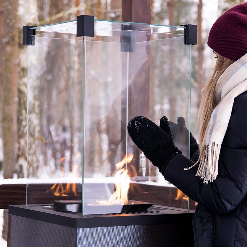 Szklane osłony nie tylko stabilizują płomień, ale również chronią przed bezpośrednim dostępem do ognia i potęgują jego blask. Dzięki bezpiecznemu i wydajnemu palnikowi ogrzewacz nie generuje dymu, przez co szyby nie wymagają kłopotliwego czyszczenia. Dedykowany pokrowiec zapewnia ochronę kominka podczas przechowywania i pomaga utrzymać go w czystości.