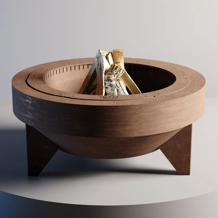 - Solidna konstrukcja i bezpieczeństwo – wykonane z wysokiej jakości stali corten, która charakteryzuje się wyjątkową trwałością i odpornością na warunki atmosferyczne. Umocowanie konstrukcji na nogach zapewnia stabilność, a głęboka misa ogranicza rozprzestrzenianie się iskier.