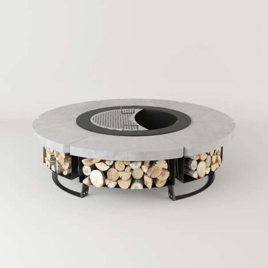 Wykorzystany beton to wysokowartościowa mieszanka o wyjątkowej wytrzymałości, sprężystości i odporności na zabrudzenia oraz uszkodzenia mechaniczne. Dzięki impregnacji wodo- i tłuszczoodpornej powierzchnia paleniska pozostaje estetyczna i łatwa w utrzymaniu. Nowoczesne, surowe wykończenie betonu doskonale wpisuje się w minimalistyczne i eleganckie aranżacje ogrodowe.