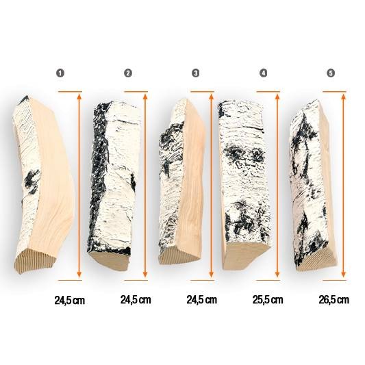 - 5 sztuk polan AkoWood (brzoza) o różnym wyglądzie i długości: 24,5 cm, 24,5 cm, 24,5 cm, 25,5 cm, 26,5 cm