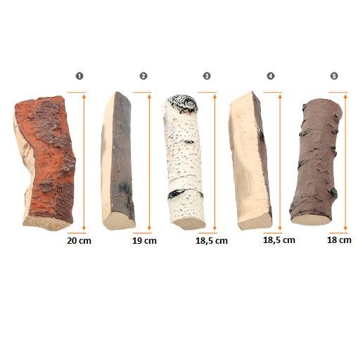 - 5 sztuk polan AkoWood (mix brzoza, sosna, buk) o różnym wyglądzie i długości: 20 cm, 19 cm, 18,5 cm, 18,5 cm, 18 cm