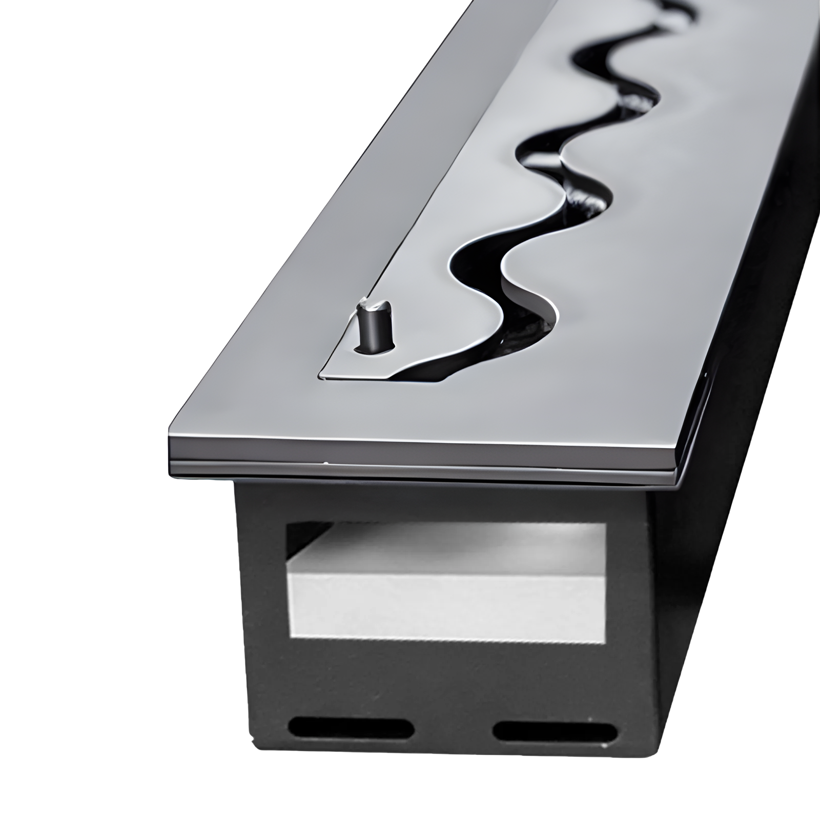 Palnik FALA to innowacyjny produkt, który wyróżnia się opatentowaną przez KAMI linią ognia w kształcie fali. Dzięki temu płomień nie jest jednolity, lecz nabiera dynamiki i przestrzenności, stając się wyjątkowym elementem dekoracyjnym nowoczesnych wnętrz. Korpus palnika wykonany jest z wysokogatunkowej stali o grubości 1,5 mm, malowanej proszkowo farbą termoodporną w eleganckim czarnym półmacie. Pokrywa górna, zbudowana z dwóch części, to element stalowy o grubości 5 mm, wycinany laserowo z najwyższą precyzją. Dzięki temu, nawet przy intensywnym nagrzewaniu, nie ulega odkształceniom i zachowuje pierwotny kształt. Idealne spasowanie krawędzi pokrywy zapewnia dokładną regulację wielkości płomienia oraz jego szybkie, bezpieczne wygaszanie.